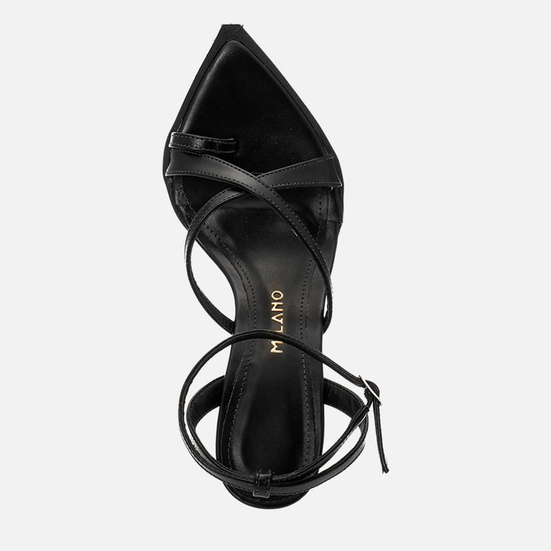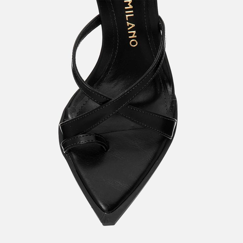 Sandália de Salto Alto Fino Bico Folha com Ring Toe ou Anel de Dedo e Tiras Cruzadas em X na cor Preto. Com salto alto fino revestido no mesmo material do produto, palmilha com solado emborrachado na cor caramelo – sob o salto e toda a parte frontal da sandália com formato oversize deixando a vira aparente, palmilha com traseira arredondada e bico fino tipo folha encaixado e macio, tira fina achatada dividindo os dedos tipo ring toe, ou anel de dedo ou dedeira, grupo de duas tiras médias cruzadas em X – na parte central onde se encontram as tiras são mais finas, possui ainda duas que saem das laterais e se cruzam no tornozelo fazendo o fechamento por fivela, que permite o ajuste e regulagem do calce. A palmilha tem aplique macio na cor nude com detalhe em costura pesponto e a marca Milano aplicada em etiqueta 3D na cor dourada.