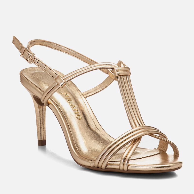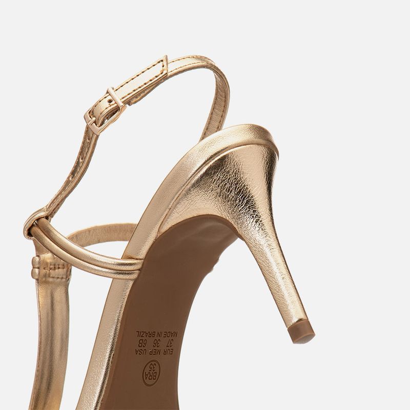 Sandália Salto Alto Fino Metalizada Festa com Tiras Estruturadas Cruzadas e Bico Arredondado na cor Ouro Light. Com solado emborrachado na cor caramelo sob o salto e parte frontal da palmilha – que tem traseira e bico arredondados, cabedal totalmente revestido em material metalizado, tiras finas e estruturadas cruzadas desenhando a silhueta, sendo: três sobre os dedos, duas saindo das laterais dos dedos e passando por baixo da outra cruzada centralmente até a base do tornozelo – onde são unidas por dois passadores da mesma tira, e depois são cruzadas até a lateral do tornozelo, uma última tira achatada é fixada nestas fazendo o fechamento por fivela, que permite o ajuste e regulagem do calce. A palmilha tem aplique macio no mesmo tom do produto com a marca Milano aplicada em etiqueta 3D na cor dourada.