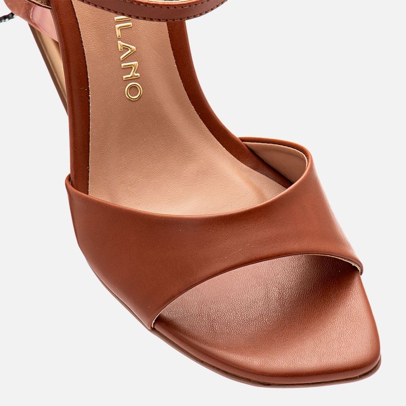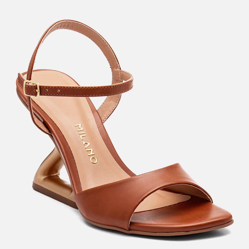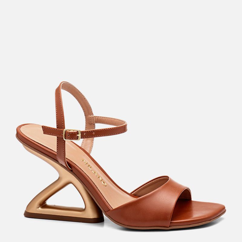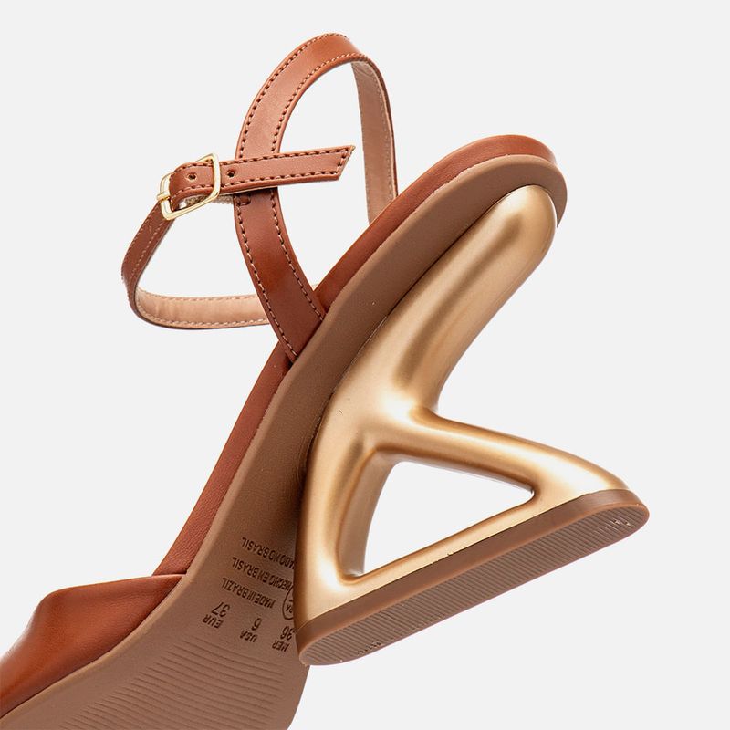 Sandália Salto Anabelado Geométrico Escultural Metalizado Dourado com Detalhe Vazado e Tiras Finas na cor Caramelo. Com solado emborrachado na cor preta na base do salto e toda palmilha, salto escultural metalizado dourado fosco com formato geométrico tipo anabelado e detalhe vazado na parte central, palmilha encaixada revestida em napa no tom do produto com a traseira arredondada e bico quadrado, tira larga sobre os dedos tipo slide com decote profundo arredondado e tira fina achatada saindo da lateral do tornozelo e cruzada no calcanhar, o fechamento é feito por tira fina fixada na tira traseira e cruzada na parte frontal do tornozelo com fivela, permitindo a regulagem e ajuste do calce. A palmilha tem aplique macio no mesmo tom do produto com a marca Milano aplicada em etiqueta 3D na cor dourada.