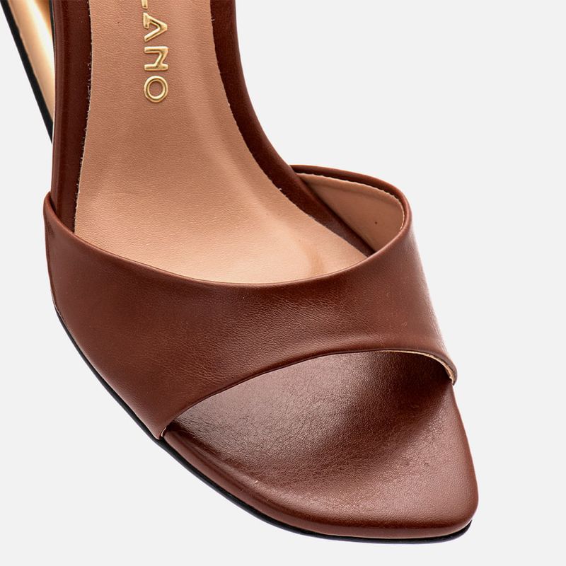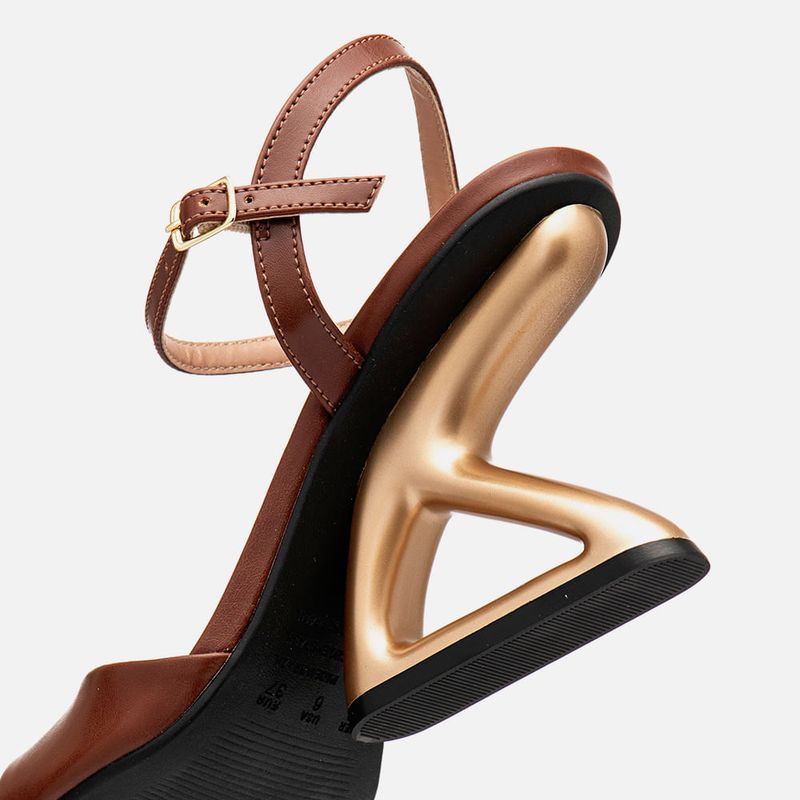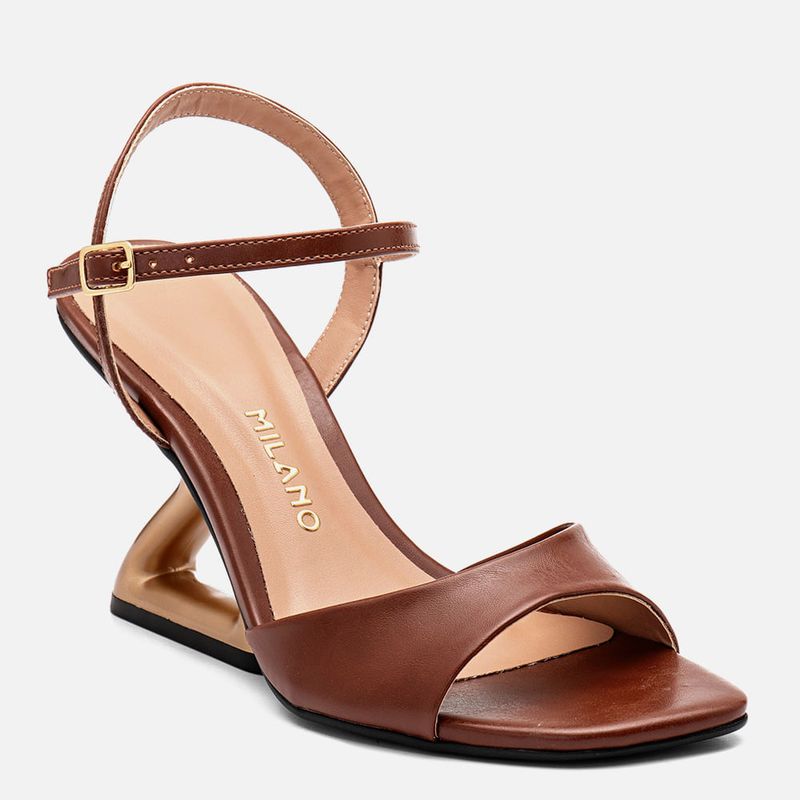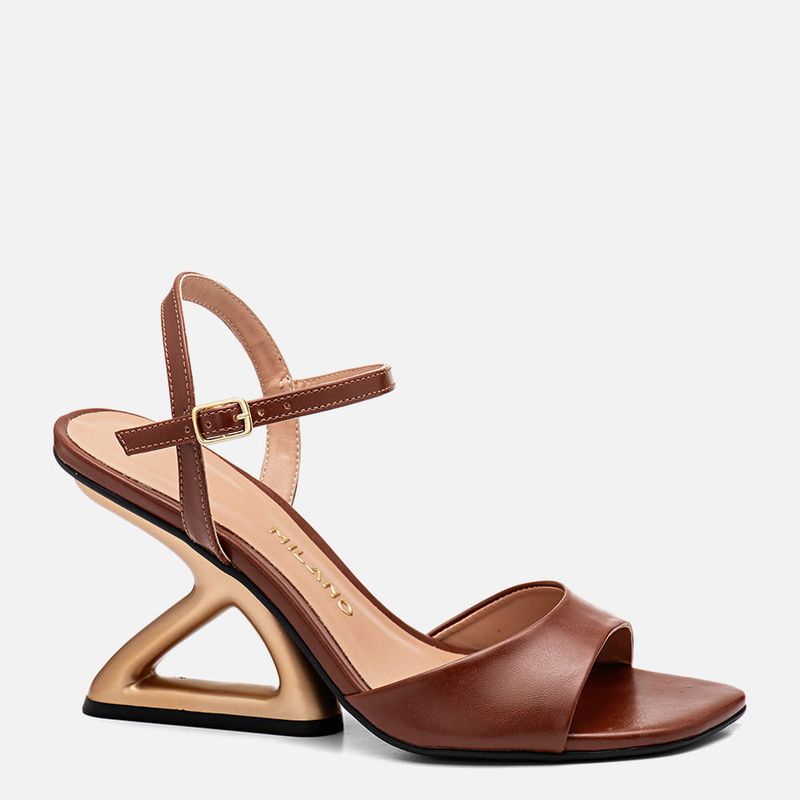 Sandália Salto Anabelado Geométrico Escultural Metalizado Dourado com Detalhe Vazado e Tiras Finas na cor Marrom. Com solado emborrachado na cor preta na base do salto e toda palmilha, salto escultural metalizado dourado fosco com formato geométrico tipo anabelado e detalhe vazado na parte central, palmilha encaixada revestida em napa no tom do produto com a traseira arredondada e bico quadrado, tira larga sobre os dedos tipo slide com decote profundo arredondado e tira fina achatada saindo da lateral do tornozelo e cruzada no calcanhar, o fechamento é feito por tira fina fixada na tira traseira e cruzada na parte frontal do tornozelo com fivela, permitindo a regulagem e ajuste do calce. A palmilha tem aplique macio no mesmo tom do produto com a marca Milano aplicada em etiqueta 3D na cor dourada.