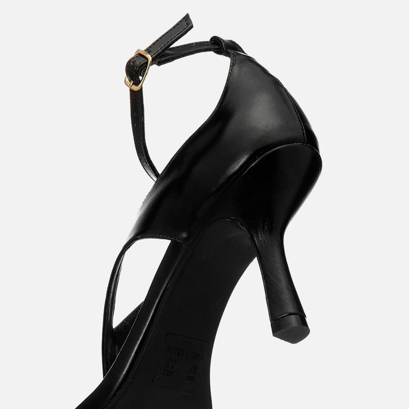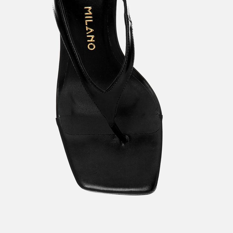 Sandália de Salto Alto Taça com Tira Thong em Y ou de Dedo com Traseira Fechada e Bico Quadrado na cor Off White. Com solado emborrachado na cor preto – sob o salto e parte frontal do modelo, salto alto tipo taça, palmilha com traseira arredondada e bico quadrado, tira thong – ou tira em Y ou tira de dedo, dividindo os dedos e unida em outra tira larga que cruza em diagonal sob o peito do pé e lateral do tornozelo até a traseira onde faz o fechamento para maior sustentação do calce, nesta peça vai um passador para tira fina que cruza no tornozelo com fechamento em fivela, que permite o ajuste e regulagem do calce. A palmilha tem aplique macio na cor nude, com detalhe em costura pesponto fazendo o contorno com a marca Milano aplicada em etiqueta 3D na cor dourada.