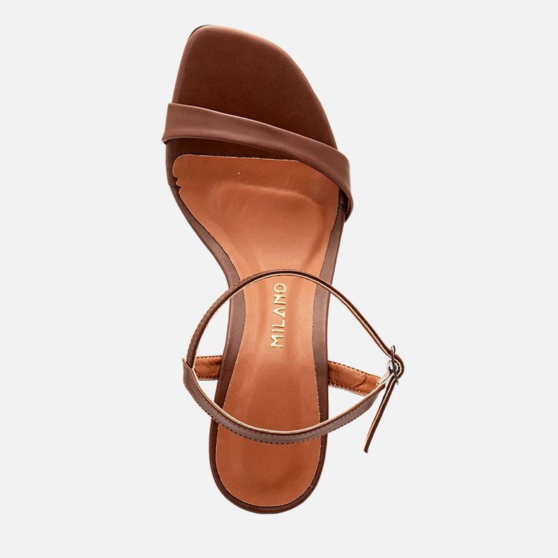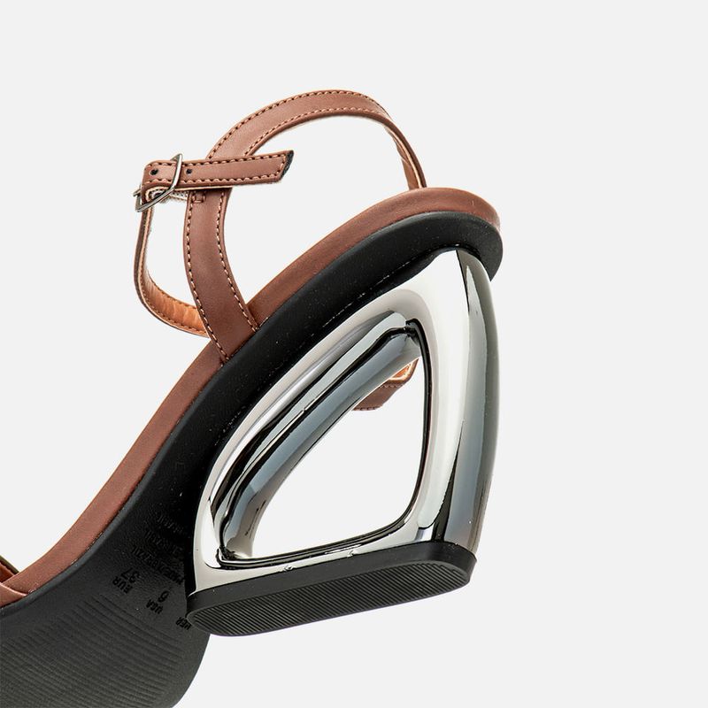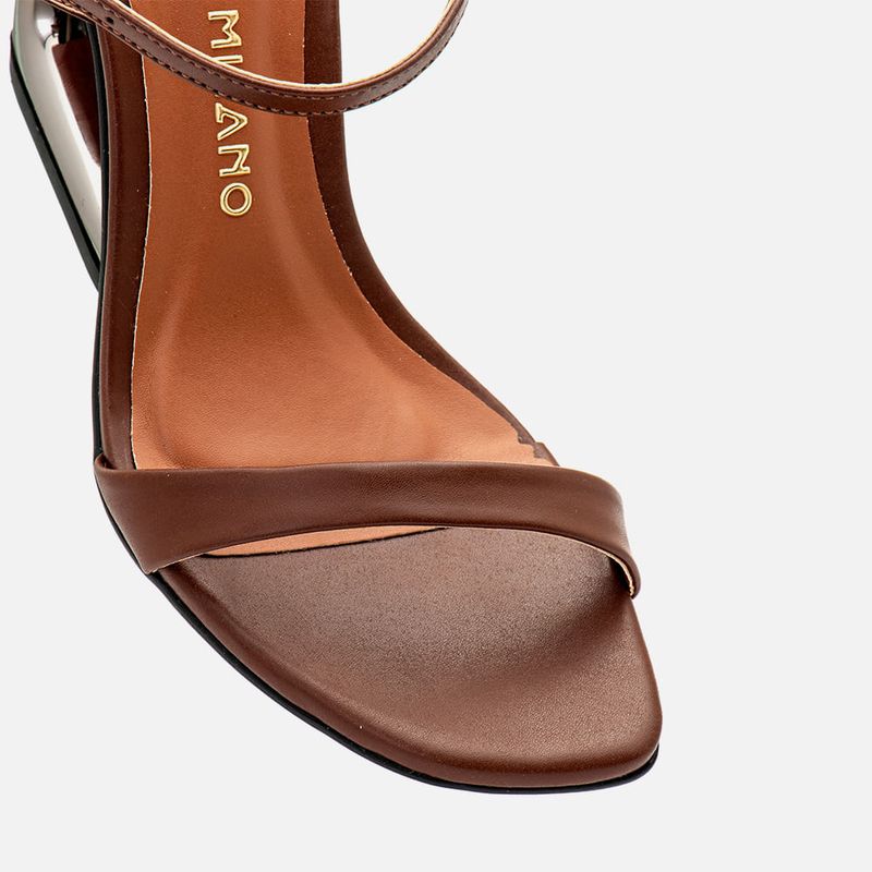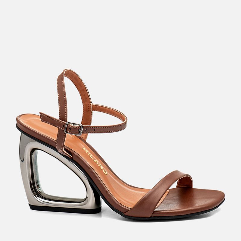 Sandália Salto Anabelado Geométrico em Metal Prata com Detalhe Vazado e tiras Finas na cor Marrom. Com solado emborrachado na cor caramelo na base do salto e palmilha, salto em metal cromado dourado com formato geométrico tipo anabelado e detalhe vazado na parte central, palmilha encaixada revestida em napa no tom do produto com a traseira arredondada e bico quadrado, tira média sobre os dedos com detalhe mais fino na parte central e tira fina achatada saindo da lateral do tornozelo e cruzada no calcanhar, o fechamento é feito por tira fina fixada na tira traseira e cruzada na parte frontal do tornozelo com fivela, permitindo a regulagem e ajuste do calce. A palmilha tem aplique macio no mesmo tom do produto com a marca Milano aplicada em etiqueta 3D na cor dourada.