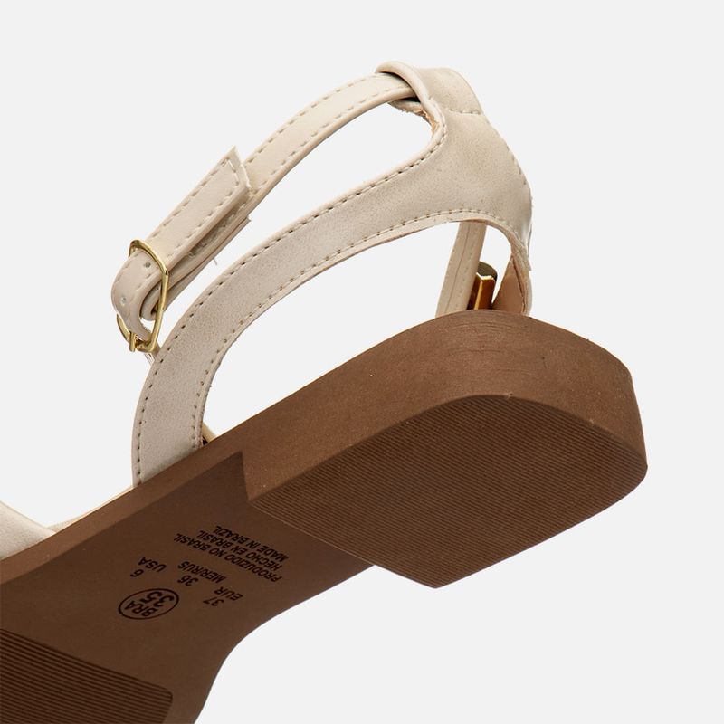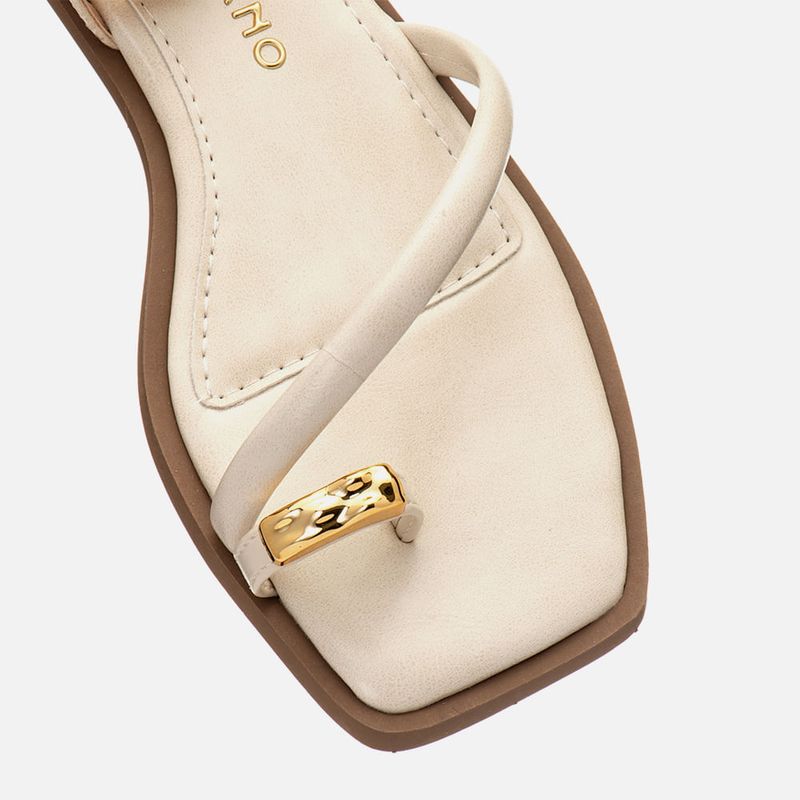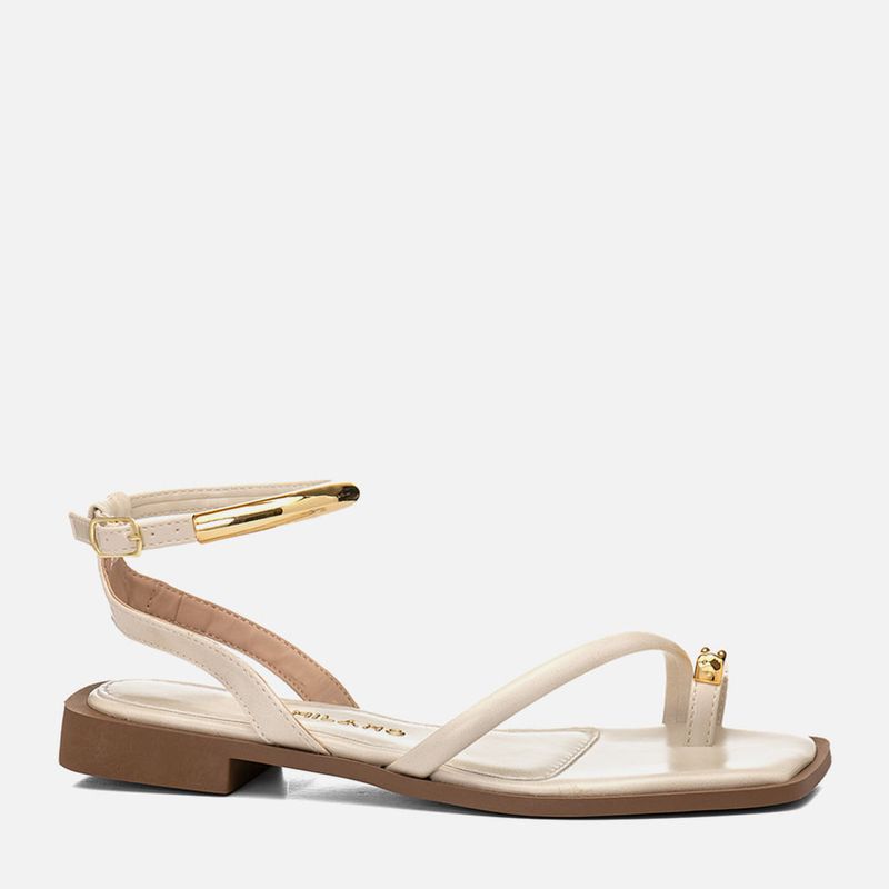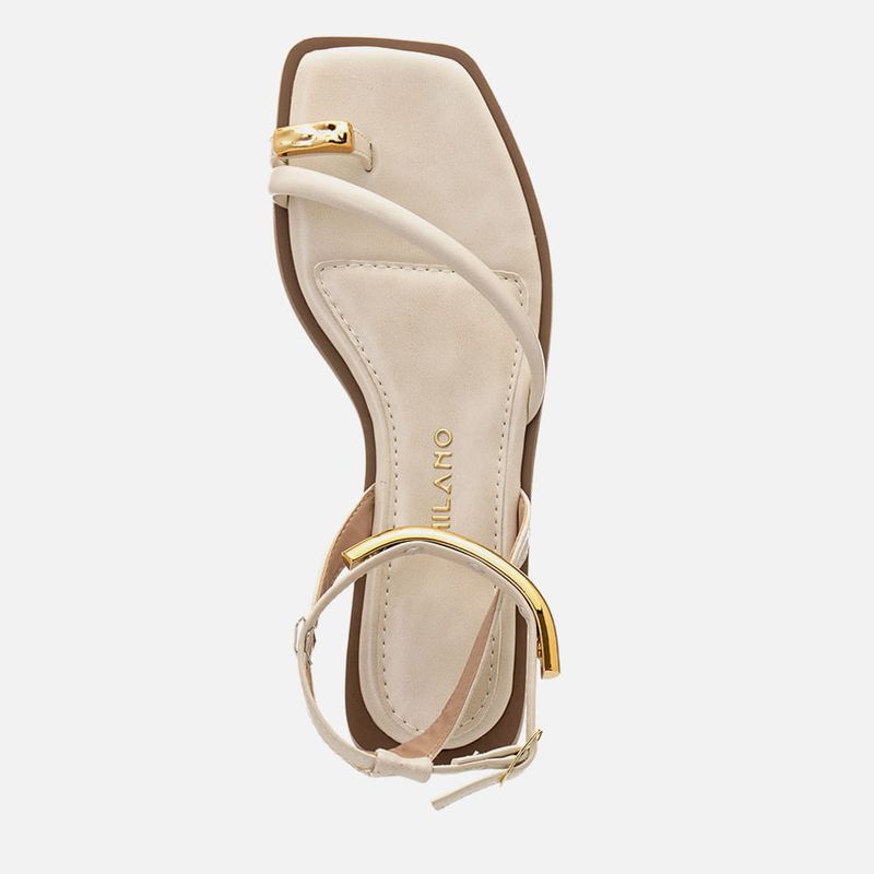 Sandália Salto Bloco Baixo com Ring Toe com Peça Metalizada com Formato Orgânico, Tira Cruzadas e Detalhe no Tornozelo em Peça Metalizada na cor Off white. Com solado emborrachado no mesmo tom do produto com salto baixo embutido, traseira e bico quadrados, com palmilha macia – com traseira arredondada e bico quadrado, encaixada deixando vira aparente, possui tira dividindo o dedão tipo ring toe, ou anel de dedo ou dedeira, tira estruturada cruzada em diagonal no peito do pé, e duas tiras achatadas que saem das laterais do tornozelo e cruzam na traseira com passador para a tira que fazer o fechamento acima do tornozelo, essa tira possui um aplique em peça metalizada cromada dourada tipo pulseira de pé, que acompanha o formato da tira, o fechamento é feito por fivela com ajuste e regulagem do calce. A palmilha tem detalhe em costura pesponto e a marca Milano em etiqueta 3D na cor dourada.