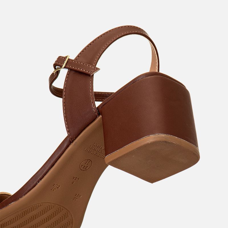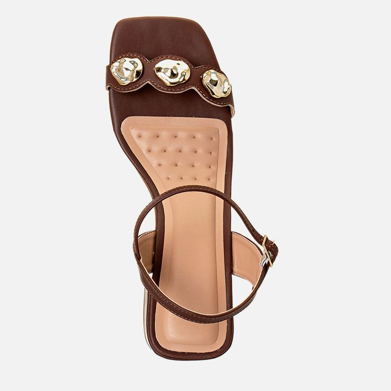 Sandália Salto Bloco Médio Palmilha Quadrado e Tira em Recorte Laser com Aplicações Boho em Peça Orgânica Metalizada Cromada na cor Marrom. Com solado emborrachado na cor caramelo, salto bloco médio e palmilha encaixada com traseira e bico quadrados, ambos revestidos em napa, tira fina sobre os dedos com recorte à laser no formato acompanhando o detalhe das aplicações – feitas em peça com formato orgânico metalizadas e cromadas na cor dourada em formato oval distorcido, tira achatada saindo das laterais do tornozelo e cruzada no calcanhar com tira frontal para fechamento através de fivela para regulagem e ajuste do calce. A palmilha tem aplique macio em tom nude com detalhe em vinco e furação para maior respirabilidade e a marca Milano aplicada em etiqueta 3D na cor dourada.
