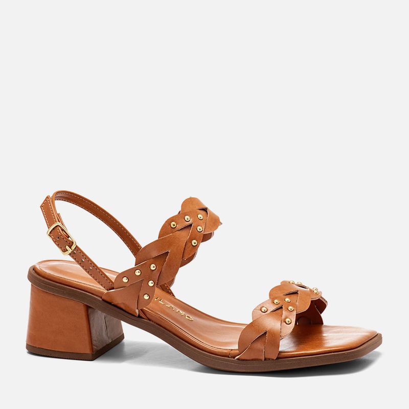 Sandália Salto Bloco Médio Trapézio Tiras Tramadas Trançadas com Aplicação Brilho Tachas Rebite Dourado na cor Caramelo. Com solado emborrachado na cor caramelo sob o salto e toda a palmilha com formato oversize tipo vira aparente, o salto tem tamanho bloco médio e formato trapézio, a palmilha é encaixada no salto e na vira, super macia com traseira arredondada e bico quadrado, as tiras são compostas por duas tiras com corte à laser tramadas e trançadas uma dentro da outra, sob os dedos e base do tornozelo, uma das tiras cruzadas tem aplicação de brilho em tachas de metal em formato de rebite na cor dourada. O fechamento é feito por tira fina achatada que sai da lateral do tornozelo e cruza no calcanhar com ajuste e regulagem do calce por fivela. A palmilha tem aplique macio no mesmo tom do produto com a marca Milano aplicada em etiqueta 3D na cor dourada.