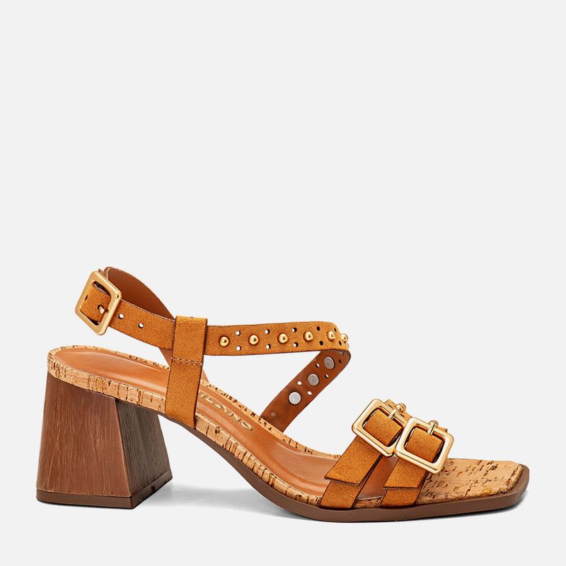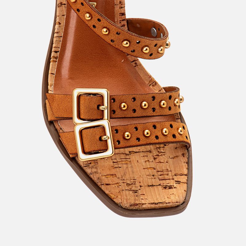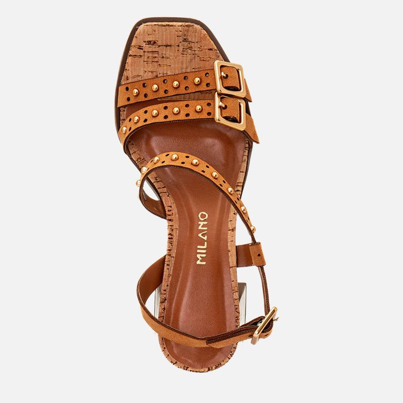 Sandália Salto Médio Bloco Amadeirado Trapézio Palmilha Cortiça Visual Natural e Tiras com Furação Fivela e Metais Tachas Rebite na cor Bege. Com solado emborrachado na cor caramelo sob o salto e parte frontal da palmilha com vira aparente, salto com altura média e formato trapézio revestido em material amadeirado, palmilha revestida em cortiça com visual natural com traseira arredondada e bico quadrado, tiras duplas médias com textura aveludada tipo camurça sob os dedos com detalhe em furação e aplicação de brilho em metal tipo tachas rebite e maxi fivela, ambos os metais são na cor dourada, outra tira saindo da lateral interna do peito do pé e cruzada em diagonal na parte interna ate a parte interna paralela ao tornozelo, essa tira tem o mesmo acabamento em furação e metais da tira dos dedos e é sustentada por tira lateral. A palmilha tem aplique em napa lisa na cor nude e macia com a marca Milano em etiqueta 3D na cor dourada.