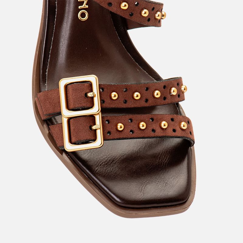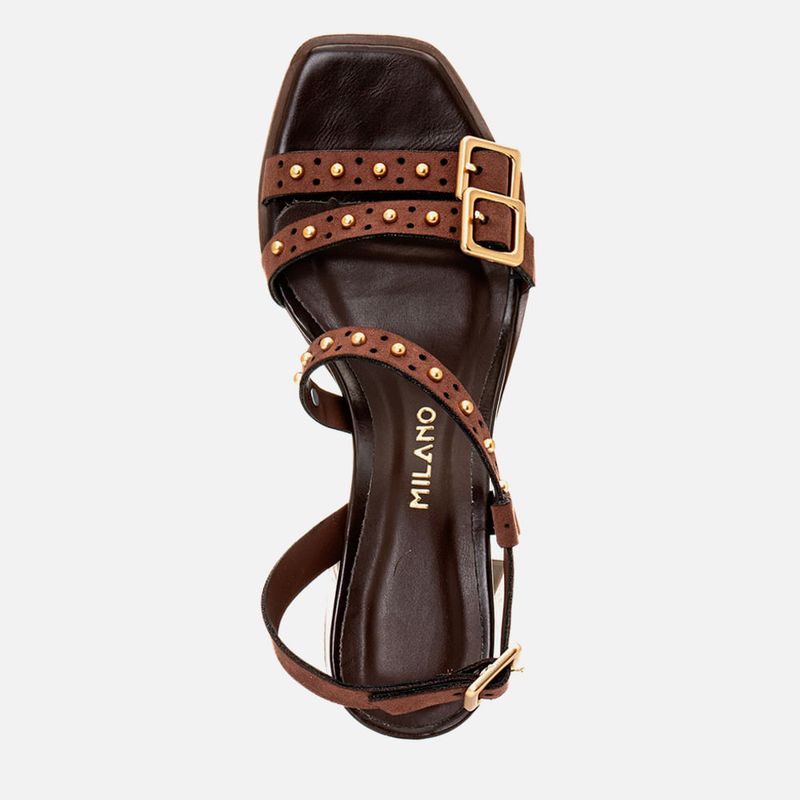 Sandália Salto Médio Bloco Amadeirado Trapézio e Tiras com Furação Fivela e Metais Tachas Rebite na cor Caramelo. Com solado emborrachado na cor caramelo sob o salto e parte frontal da palmilha com vira aparente, salto com altura média e formato trapézio revestido em material amadeirado, palmilha revestida em napa lisa com traseira arredondada e bico quadrado, tiras duplas médias com textura aveludada tipo carmurça sob os dedos com detalhe em furação e aplicação de brilho em metal tipo tachas rebite e maxi fivela, ambos os metais são na cor dourada, outra tira saindo da lateral interna do peito do pé e cruzada em diagonal na parte interna ate a parte interna paralela ao tornozelo, essa tira tem o mesmo acabamento em furação e metais da tira dos dedos e é sustentada por tira lateral. A palmilha tem aplique em napa lisa na cor nude e macia com a marca Milano em etiqueta 3D na cor dourada.