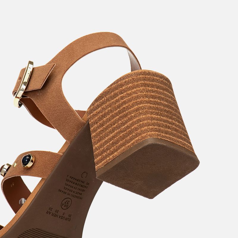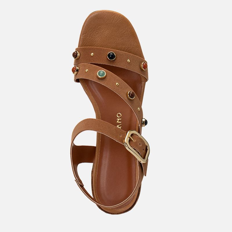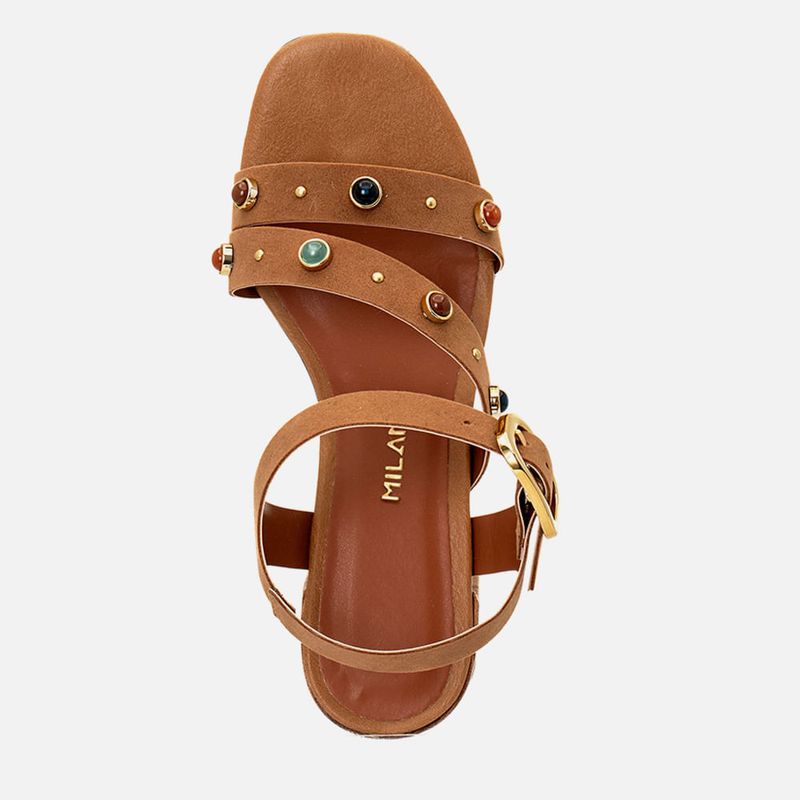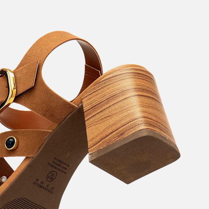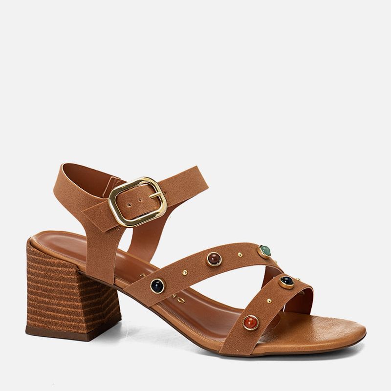 Sandália Salto Medio Bloco Trapézio Textura Madeira com Tiras Médias com Aplicação em Mix de Metais e Tachas Boho Multicolor na cor Caramelo. Com solado emborrachado na cor caramelo – sob o salto e parte frontal da palmilha, palmilha encaixada revestida em napa com traseira arredondada e bico quadrado, grupo de tiras achatadas médias com aplicação em mix de metais e tachas/studs, no estilo Boho, sendo: metal arredondado dourado com pedraria em resina de esfera e mini rebites também em dourado, as tiras são em material aveludado tipo camurça sendo: uma sobre os dedos, uma cruzada em diagonal no peito do pé e uma tira na lateral do tornozelo e depois cruzada no calcanhar, essa tira possui maxi fivela quadrada em metal para fechamento e ajuste de regulagem do calce. A palmilha tem a marca Milano aplicada em etiqueta 3D na cor dourada.