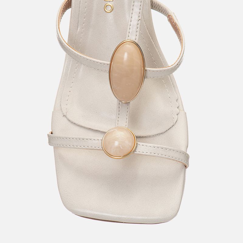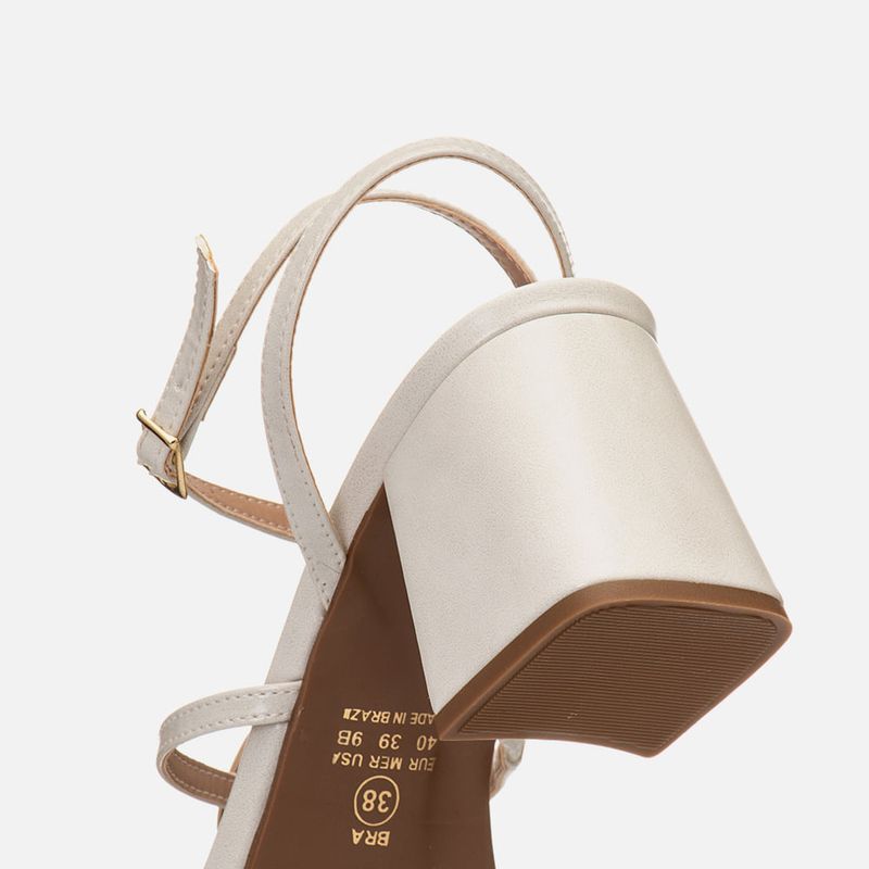 Sandália de Salto Médio Bloco tipo Trapézio com Bico Quadrado e Tiras Finas Cruzadas com Aplicação em Peça Metalizada com Pedraria em Resina na cor Off White. Com solado emborrachado na cor caramelo, salto bloco médio com formato trapézio, palmilha encaixada com traseira arredondada e bico quadrado, tiras finas achatadas cruzadas desenhando a silhueta sendo: uma sobre os dedos, uma no peito do pé e duas que saem das laterais e se cruzam no tornozelo, essas tiras são cruzadas por outra que sobe o peito do pé conectando todas as tiras, e possuem aplicação de brilho feito em peça metalizada na cor dourada em formato redondo e oval, com aplicação de pedraria em resina rajada no mesmo tom do produto. O fechamento é feito por fivela que permite ajuste e regulagem do calce e a palmilha tem aplique macio no mesmo tom do produto com a marca Milano aplicada em etiqueta 3D na cor dourada.