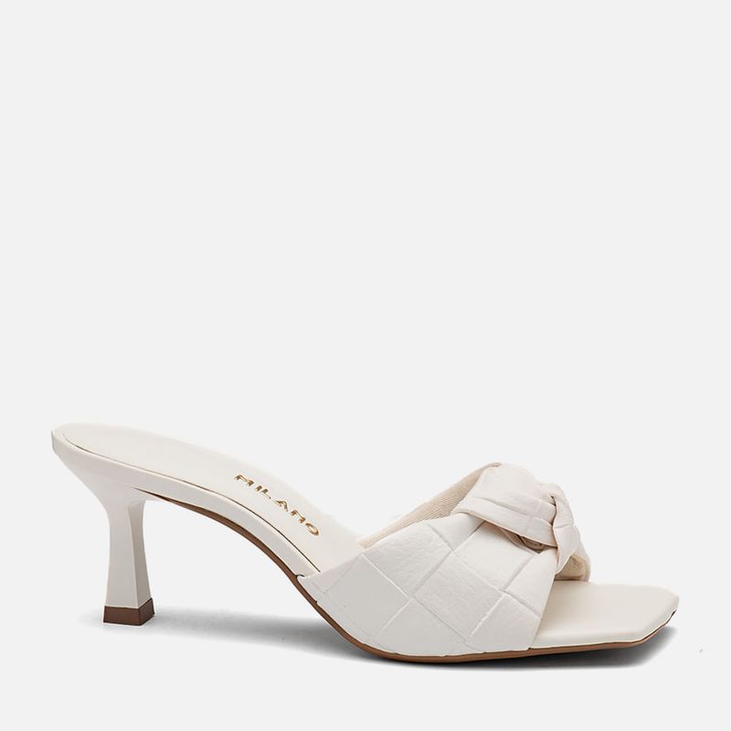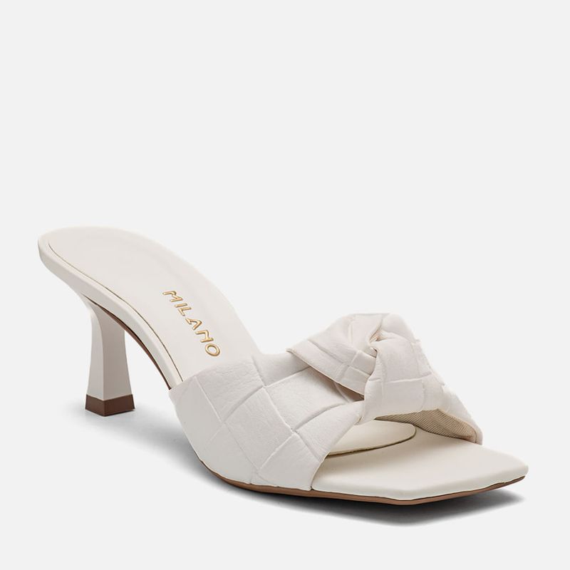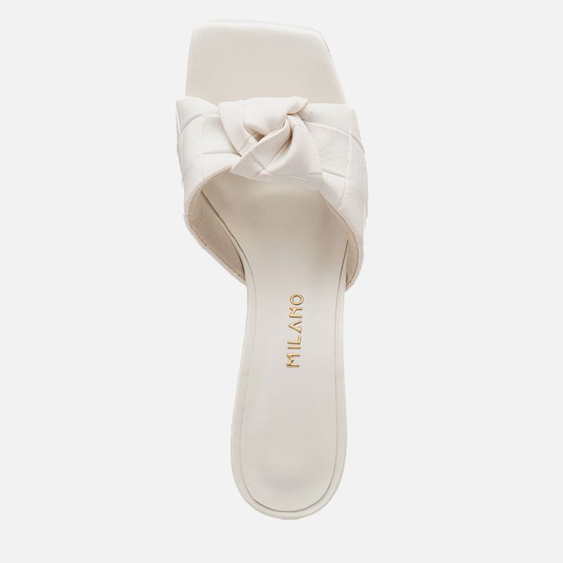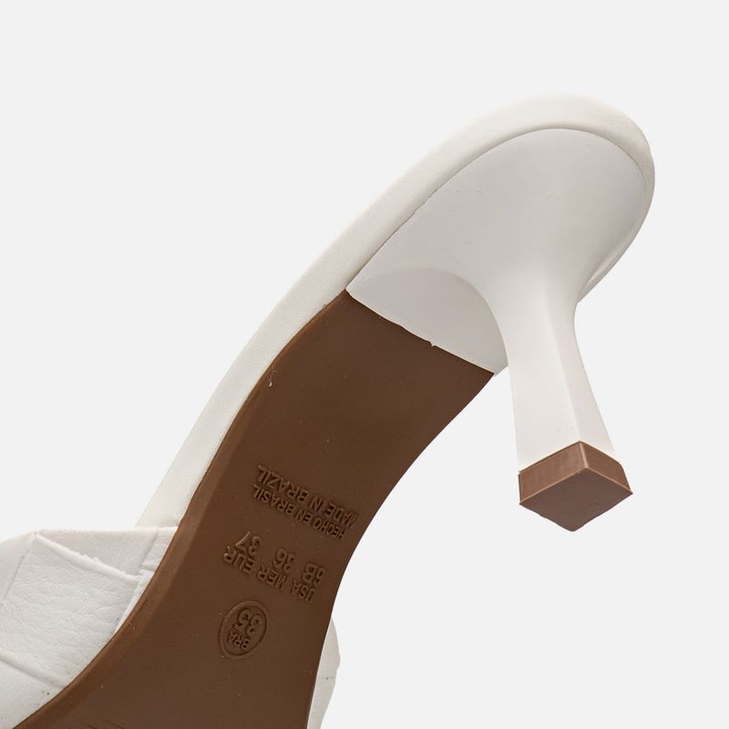 Sandália Tamanco Aberta com Salto Médio Fino Taça Tira em Tramado Tressê e Nozinho na cor Off white. Com solado emborrachado caramelo sob o salto e parte frontal da palmilha – traseira arredondada e bico quadrado, tira slide com decote redondo no peito do pé feita em tramado da napa tipo tressê em padrão xadrez com detalhe em nozinho sobre os dedos. O modelo é aberto de calce prático e tem aplique macio na palmilha com a marca Milano aplicada em etiqueta 3D na cor dourada.