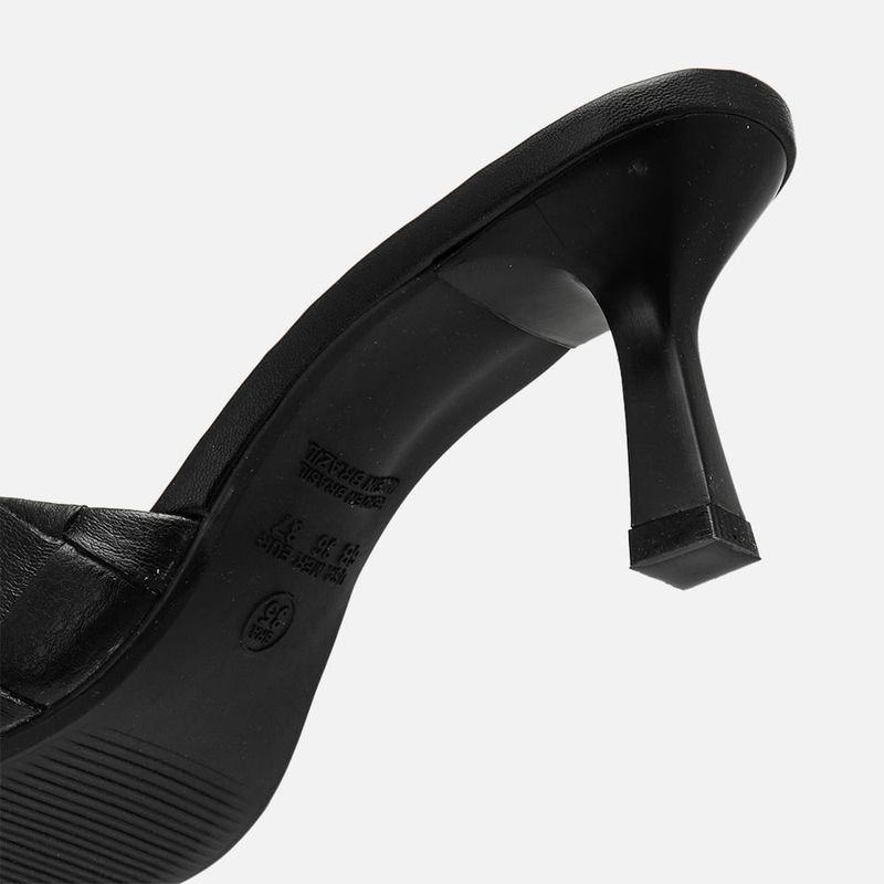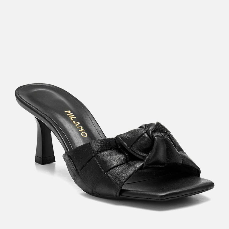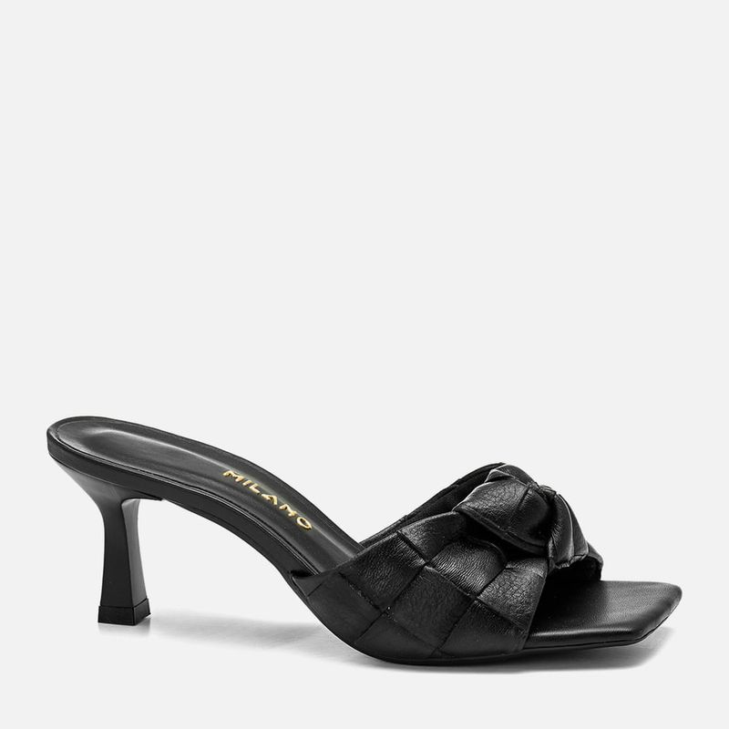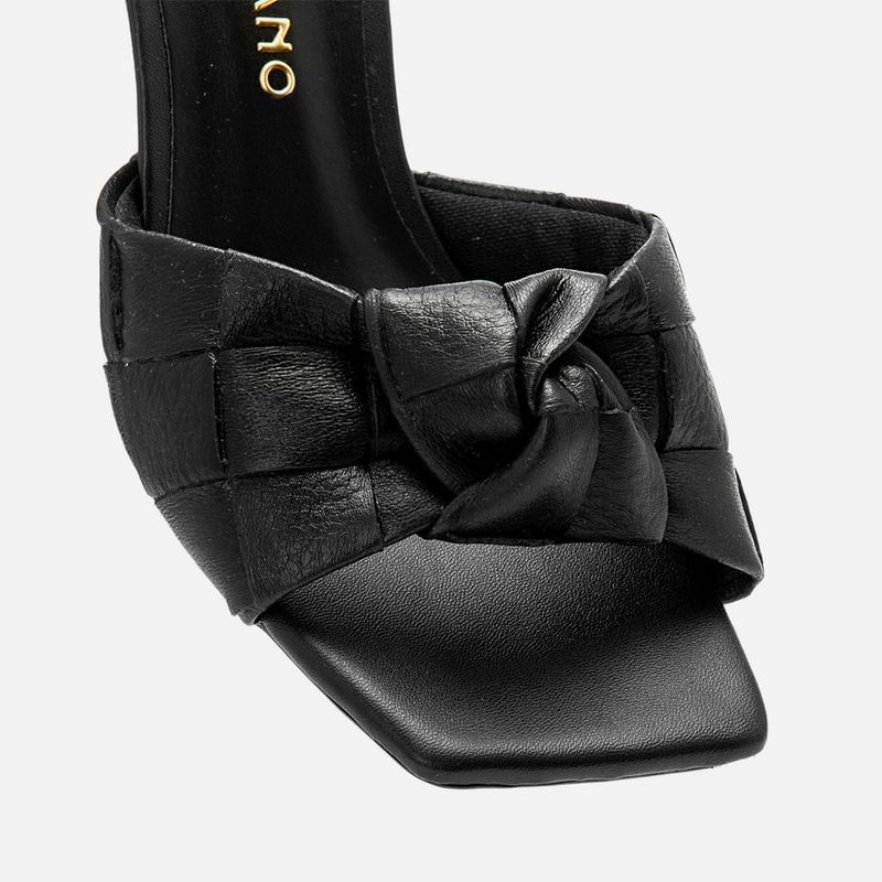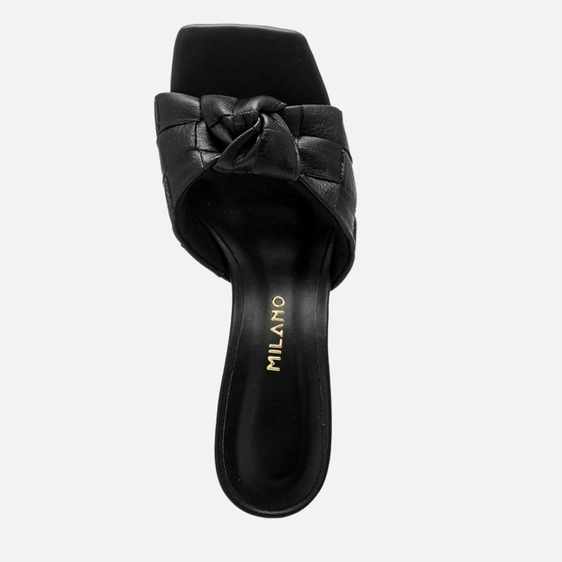 Sandália Tamanco Aberta com Salto Médio Fino Taça Tira em Tramado Tressê e Nozinho na cor Preto. Com solado emborrachado caramelo sob o salto e parte frontal da palmilha – traseira arredondada e bico quadrado, tira slide com decote redondo no peito do pé feita em tramado da napa tipo tressê em padrão xadrez com detalhe em nozinho sobre os dedos. O modelo é aberto de calce prático e tem aplique macio na palmilha com a marca Milano aplicada em etiqueta 3D na cor dourada.