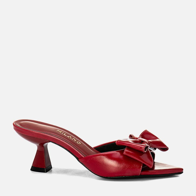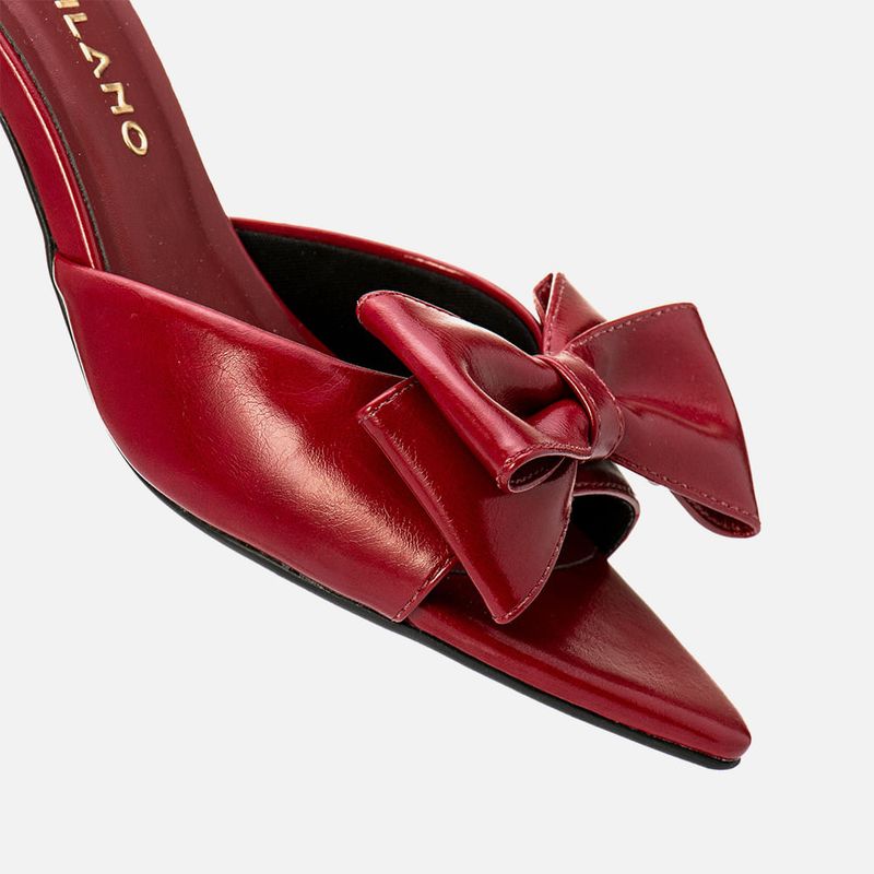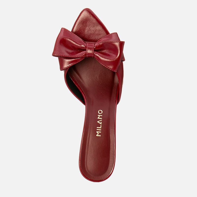 Sandália Tamanco Aberto com Salto Médio Flare Bico Fino tipo Folha e Tira Larga Slide com Detalhe em Maxi Laço na cor Marsala. Com salto médio fino tipo flare – com a base levemente maior que o topo, no mesmo tom do produto, solado emborrachado na cor caramelo, palmilha com traseira arredondada e bico fino tipo folha, tira larga sobre os dedos e peito do pé tipo slide com decote fundo arredondado e detalhe em aplique de maxi laço duplo sobre os dedos, modelo aberto na traseira de calce prático. A palmilha tem aplique macio no mesmo tom do produto com a marca Milano em etiqueta 3D na cor dourada.