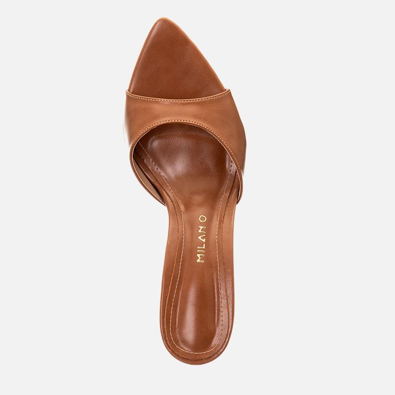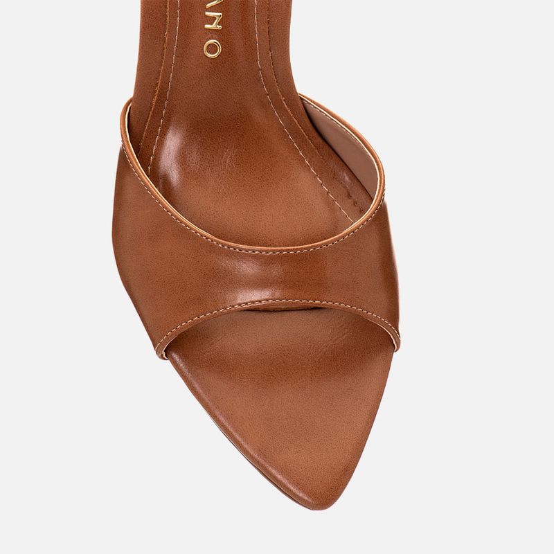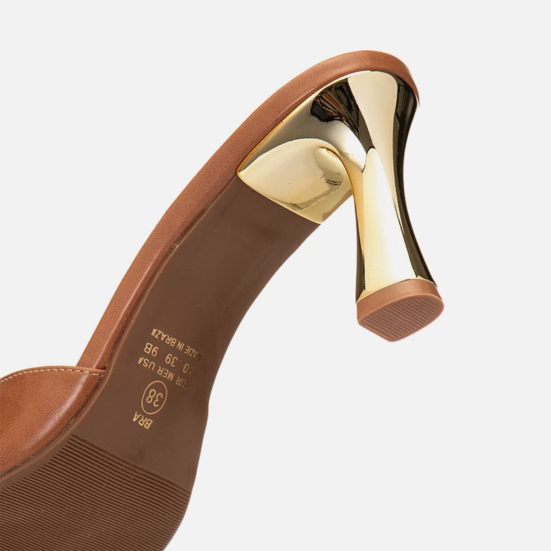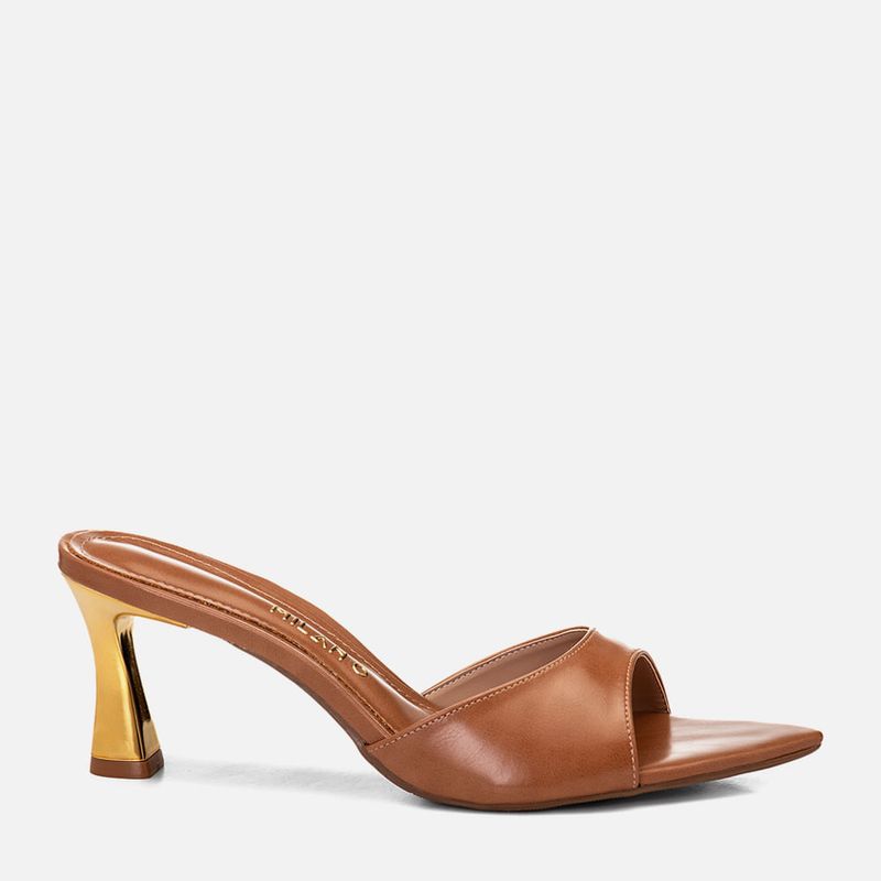 Sandália Tamanco Aberto com Salto Alto Flare Metalizado Dourado Bico Folha e Tira Larga Slide na cor Caramelo. Com salto alto fino tipo flare – com a base levemente maior que o topo, metalizado e cromado na cor dourada, com solado emborrachado no mesmo tom do produto, palmilha com traseira arredondada e bico fino tipo folha, tira larga sobre os dedos e peito do pé tipo slide com recorte arredondado no peito do pé, modelo aberto na traseira de calce prático. A palmilha tem aplique macio no mesmo tom do produto com a marca Milano em etiqueta 3D na cor dourada.