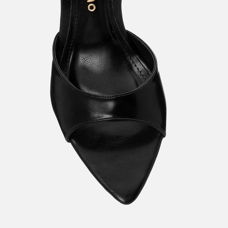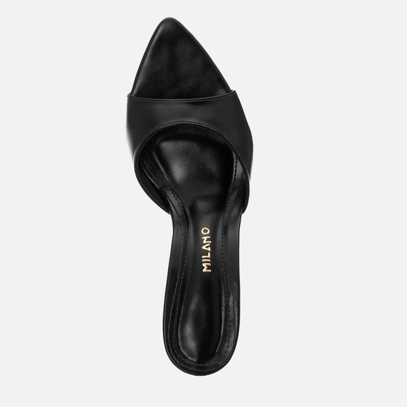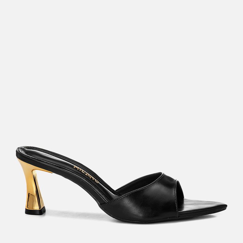 Sandália Tamanco Aberto com Salto Alto Flare Metalizado Dourado Bico Folha e Tira Larga Slide na cor Preto. Com salto alto fino tipo flare – com a base levemente maior que o topo, metalizado e cromado na cor dourada, com solado emborrachado no mesmo tom do produto, palmilha com traseira arredondada e bico fino tipo folha, tira larga sobre os dedos e peito do pé tipo slide com recorte arredondado no peito do pé, modelo aberto na traseira de calce prático. A palmilha tem aplique macio no mesmo tom do produto com a marca Milano em etiqueta 3D na cor dourada.