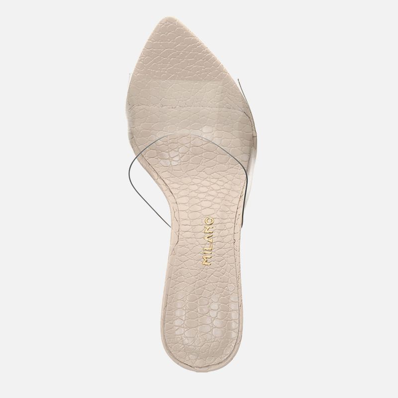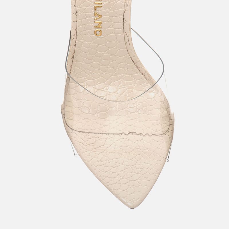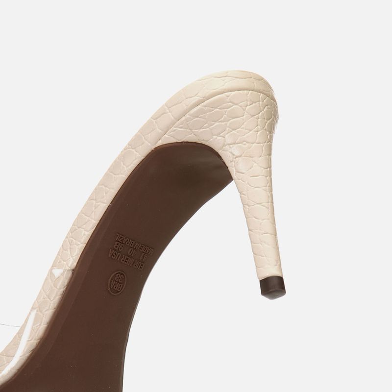 Sandália tipo Tamanco com Salto Alto Textura Animal Print Cobra Bico Folha e Tira Slide em Vinil Cristal Transparência na cor Off White. Com solado emborrachado na cor caramelo, salto alto fino, palmilha com traseira arredondada e bico fino tipo folha, tira larga tipo slide feita em vinil cristal com transparência com decote arredondado no peito do pé, sendo aberta na traseira e deixando o calcanhar à mostra. A palmilha tem aplique macio no mesmo material do produto, com a marca Milano aplicada em etiqueta 3D na cor dourada.