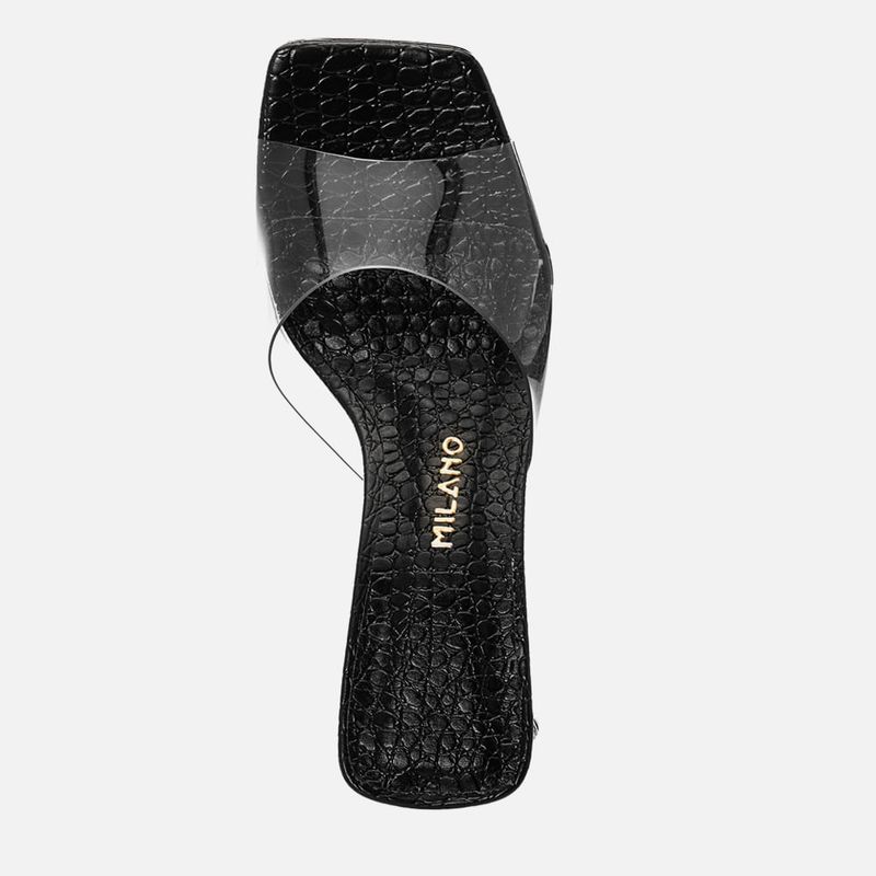 Sandália tipo Tamanco com Salto Alto Bloco Geométrico Triangular Textura Animal Print Cobra e Tira Slide em Vinil Cristal Transparência na cor Preto. Com solado emborrachado na cor caramelo, salto alto bloco geométrico com formato triangular, palmilha com traseira e bico quadrado, revestida em napa com textura animal print de cobra, tira larga tipo slide feita em vinil cristal com transparência com decote arredondado no peito do pé, sendo aberta na traseira e deixando o calcanhar à mostra. A palmilha tem aplique macio no mesmo material do produto, com a marca Milano aplicada em etiqueta 3D na cor dourada.