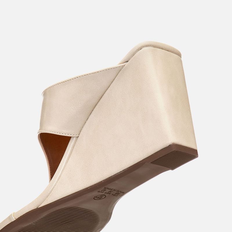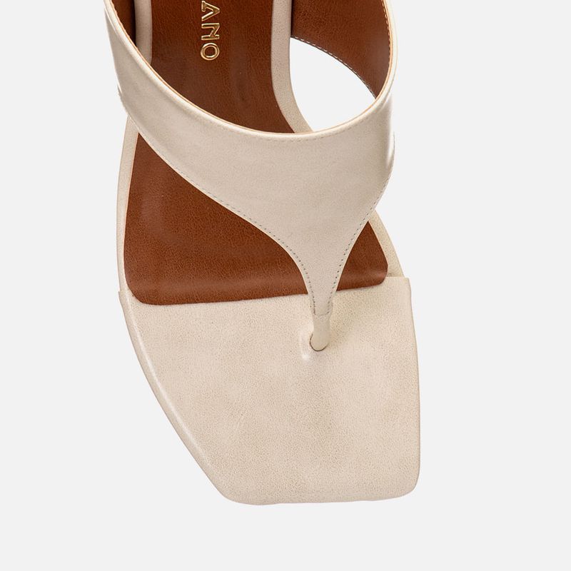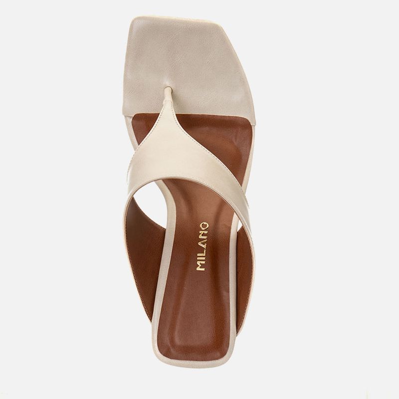 Sandália tipo Tamanco com Salto Anabelado Alto e Tira Thong com Palmilha e Bico Quadrado na cor Off White. Com solado emborrachado na cor caramelo, salto alto tipo anabela alto, palmilha com traseira e bico quadrados, tira dividindo os dedos e subindo pelo peito do pé tipo tipo thong – ou tira em Y ou tira de dedo, esta tira é fixada nas laterais da base do tornozelo, sendo aberta na traseira e deixando o calcanhar à mostra. A palmilha tem aplique macio na cor caramelo, com a marca Milano aplicada em etiqueta 3D na cor dourada.