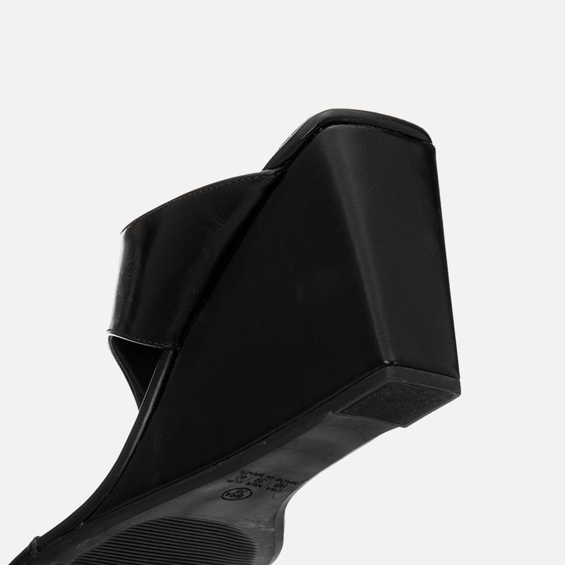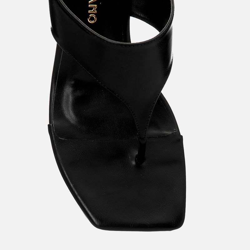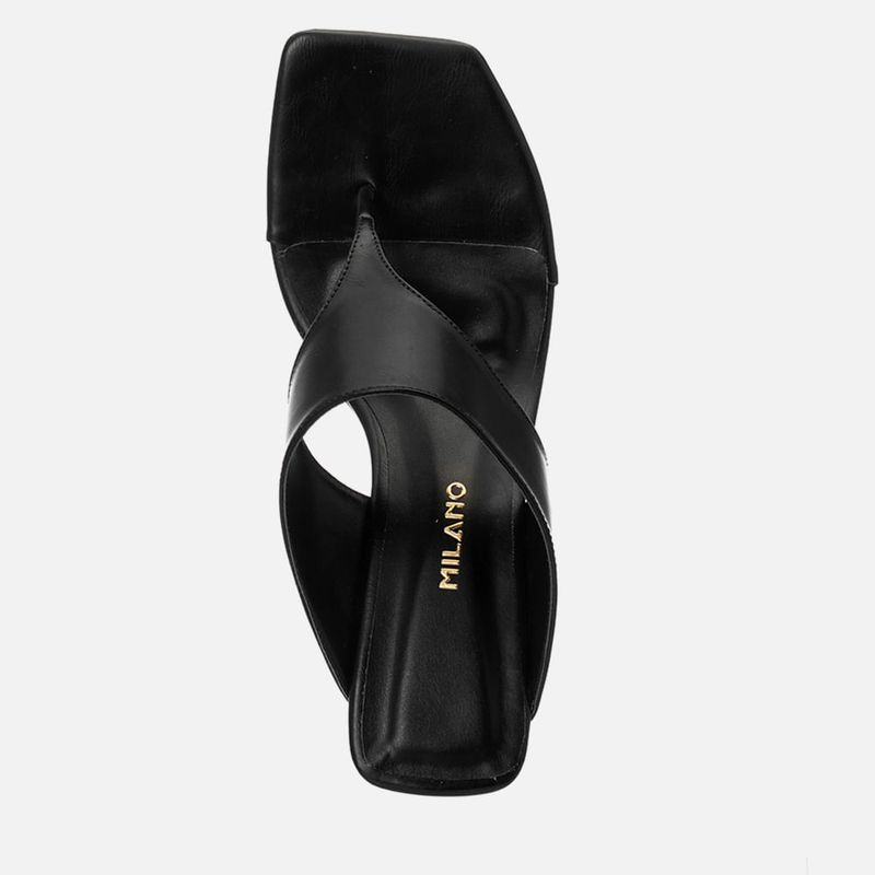 Sandália tipo Tamanco com Salto Anabelado Alto e Tira Thong com Palmilha e Bico Quadrado na cor Preto. Com solado emborrachado na cor caramelo, salto alto tipo anabela alto, palmilha com traseira e bico quadrados, tira dividindo os dedos e subindo pelo peito do pé tipo tipo thong – ou tira em Y ou tira de dedo, esta tira é fixada nas laterais da base do tornozelo, sendo aberta na traseira e deixando o calcanhar à mostra. A palmilha tem aplique macio na cor caramelo, com a marca Milano aplicada em etiqueta 3D na cor dourada.