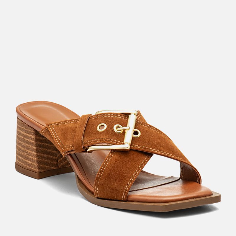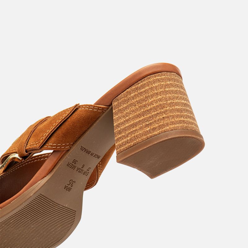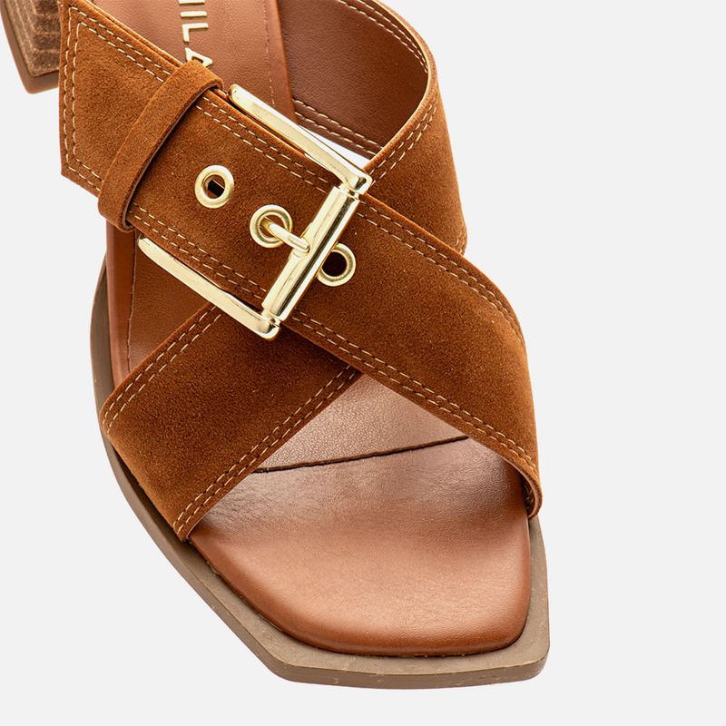 Sandália Tamanco Salto Bloco Médio Amadeirado com Tiras em X e Maxi Fivela na cor Caramelo tipo Camurça. Com solado emborrachado na cor caramelo sob o salto e parte frontal da palmilha deixando a vira aparente, salto médio bloco tipo trapézio (meia lua) e palmilha super macia encaixada revestida em napa lisa com traseira arredondada e bico quadrado, duas tiras largas cruzadas em X sobre o peito do pé, deixando os dedos aparentes, as tiras são feitas em material aveludado tipo carmurça com detalhe em contorno feito em costura pesponto dupla, e na tira externa tem uma maxi fivela em metal dourado com 3 ilhós somente decorativa, o modelo tem a traseira aberta com calce prático. A palmilha tem aplique macio no mesmo tom do produto com a marca Milano em etiqueta 3D na cor dourada.