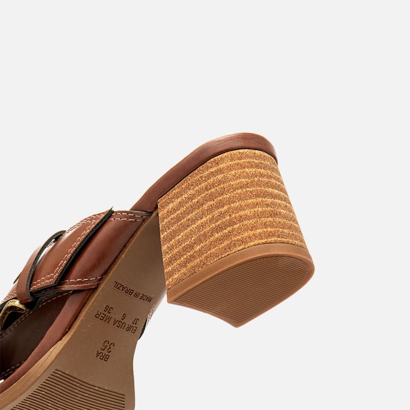 Sandália Tamanco Salto Bloco Médio Amadeirado com Tiras em X e Maxi Fivela na cor Marrom. Com solado emborrachado na cor caramelo sob o salto e parte frontal da palmilha deixando a vira aparente, salto médio bloco tipo trapézio (meia lua) e palmilha super macia encaixada revestida em napa lisa com traseira arredondada e bico quadrado, duas tiras largas cruzadas em X sobre o peito do pé, deixando os dedos aparentes, as tiras são feitas no mesmo material da palmilha com detalhe em contorno feito em costura pesponto dupla, e na tira externa tem uma maxi fivela em metal dourado com 3 ilhós somente decorativa, o modelo tem a traseira aberta com calce prático. A palmilha tem aplique macio no mesmo tom do produto com a marca Milano em etiqueta 3D na cor dourada.