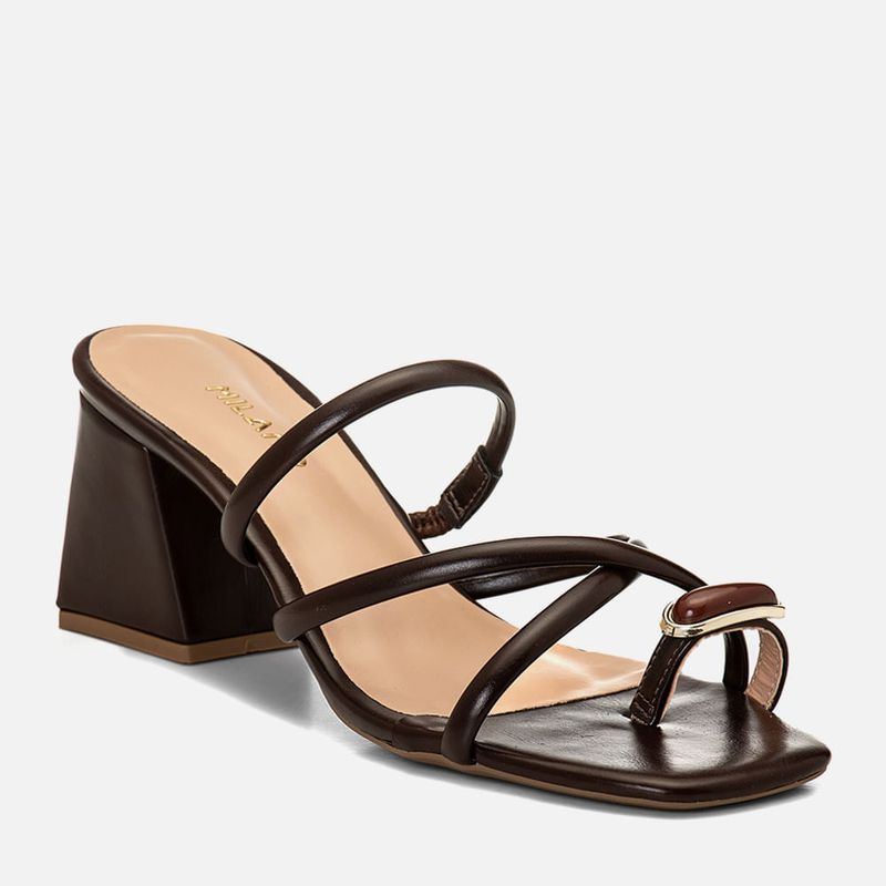 Sandália Tamanco com Salto Médio Bloco Trapézio e Ring Toe ou Anel de Dedo com Aplicação de Peça Metalizada e Pedraria em Resina na cor Café. Com solado emborrachado no mesmo tom do produto – sob o salto e cabedal, salto médio bloco tipo trapézio revestido em napa, palmilha encaixada com traseira arredondada e bico quadrado com cantos arredondados, tira fina achatada dividindo o dedão tipo ring toe – ou anel de dedo ou dedeira, com aplique em peça metalizada na cor dourada com formato retangular ovalado com pedraria em resina no mesmo tom do produto e tiras finas estruturadas sendo: duas cruzadas em X saindo da lateral dos dedos e cruzadas no peito do pé e outra no peito do pé – esta tira tem elástico na parte interna para maior sustentação do calce – que é prático sem amarrações ou fechamentos. A palmilha tem aplique macio em napa nude com a marca Milano aplicada em etiqueta 3D na cor dourada.
