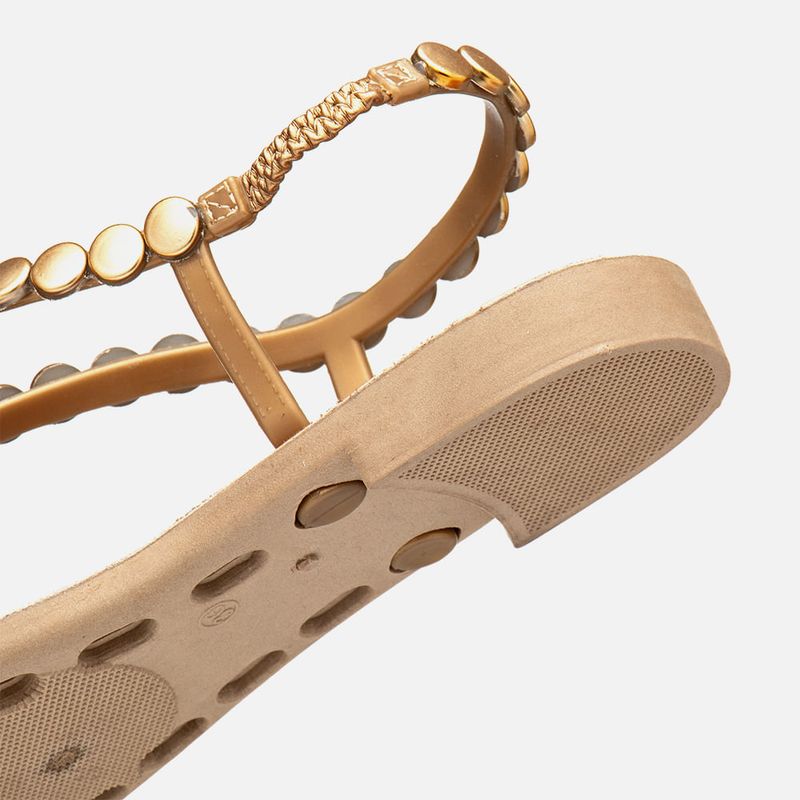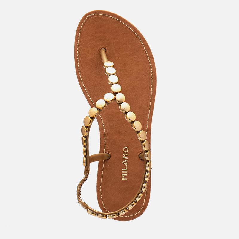 Sandália Tipo Chinelo de Dedo Fechada Tiras com Aplicação de Brilho em tipo Medalha Metalizada, Solado Emborrachado Macio Conforto e Calce Prático Elástico na cor Ouro. Com solado emborrachada macio com saltinho mínimo, aplique na parte superior em napa com detalhe em contorno do formato em costura pesponto, tira emborrachada em peça única tipo chinelo dividindo os dedos e cruzada sobre o peito do pé até o tornozelo fazendo o fechamento em elástico tipo sandália – essa tira possui aplicações de peças metalizadas tipo medalhas na cor dourado metalizado cromado. O fechamento é feito em elástico com calce prático, essa tira é fixada por duas hastes nas laterais e tem detalhes nas tira que imitam costura feitas já na peça plástica. A palmilha tem a marca Milano aplicada em etiqueta 3D na cor dourada.