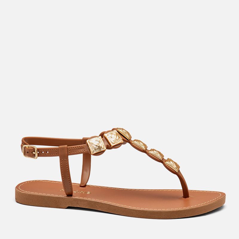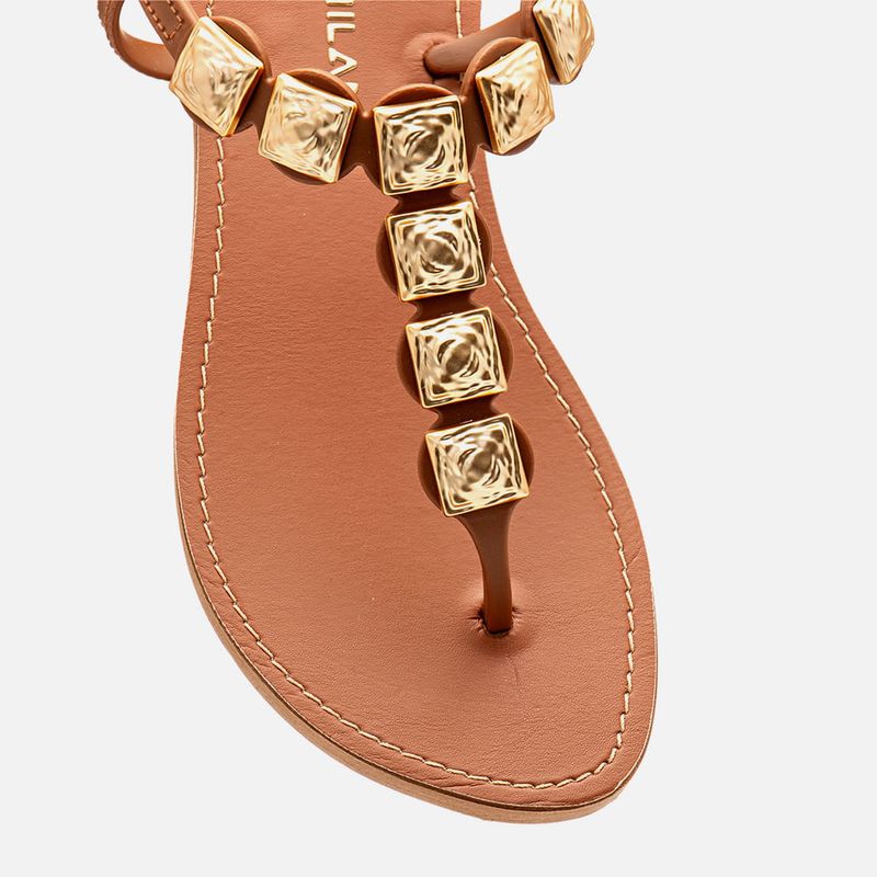 Sandália tipo Chinelo de Dedo Aberta com Aplicação de Brilho em Peça Metalizada Quadrada com Textura Orgânica e Palmilha Emborrachada Macia na cor Caramelo. Com palmilha emborrachada macia, com aplique na parte superior em napa com detalhe em contorno do formato em costura pesponto, tira emborrachada em peça única tipo chinelo dividindo os dedos e cruzada sobre o peito do pé até o tornozelo fazendo o fechamento tipo sandália – essa tira possui formato em recorte redondo onde são aplicadas as peças metalizadas quadradas com textura na parte superior tipo orgânica. Com fechamento em fivela e ajuste de regulagem, essa tira é fixada por duas hastes nas laterais e tem detalhes nas tiras que imitam costura feitas já na peça plástica. A palmilha tem a marca Milano aplicada em etiqueta 3D na cor dourada.