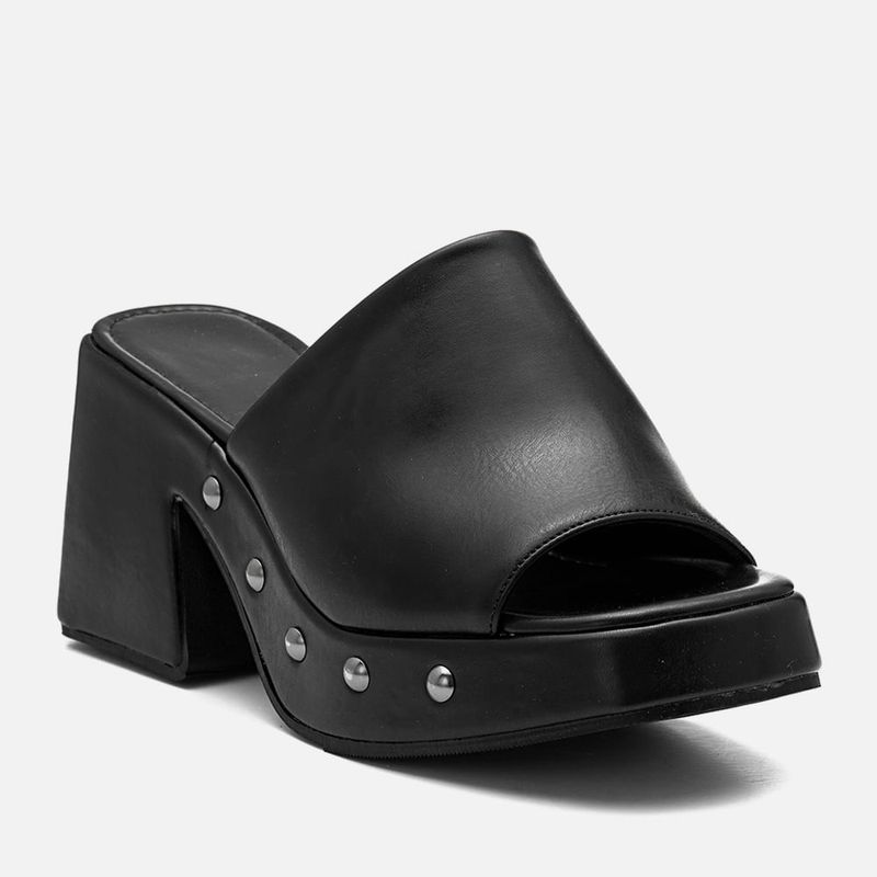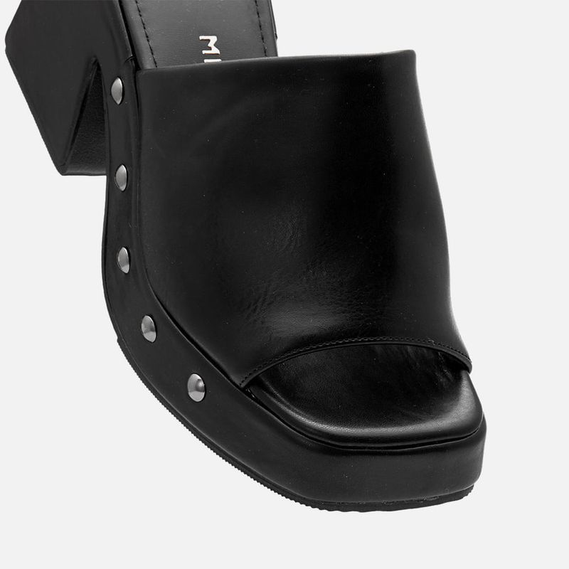 Sandália tipo Tamanco Plataforma Aberto Salto Alto com Tachas Boho na cor Preto. Com solado emborrachado na cor caramelo com antiderrapante na parte frontal, salto tipo plataforma bipartido destacando o salto bloco e a meia pata prontal alto, palmilha macia encaixada com traseira e bico quadrado com cantos arredondados, a palmilha tem detalhe em contorno feito em costura pesponto. A tira sobre os dedos e peito do pé é tipo slide larga com decorte arredondado deixando os dedos à mostra, o modelo é aberto de calce prático. A palmilha tem a marca Milano aplicada em etiqueta 3D na cor dourada.