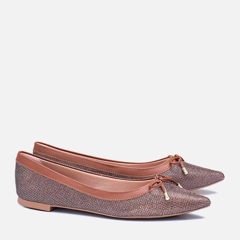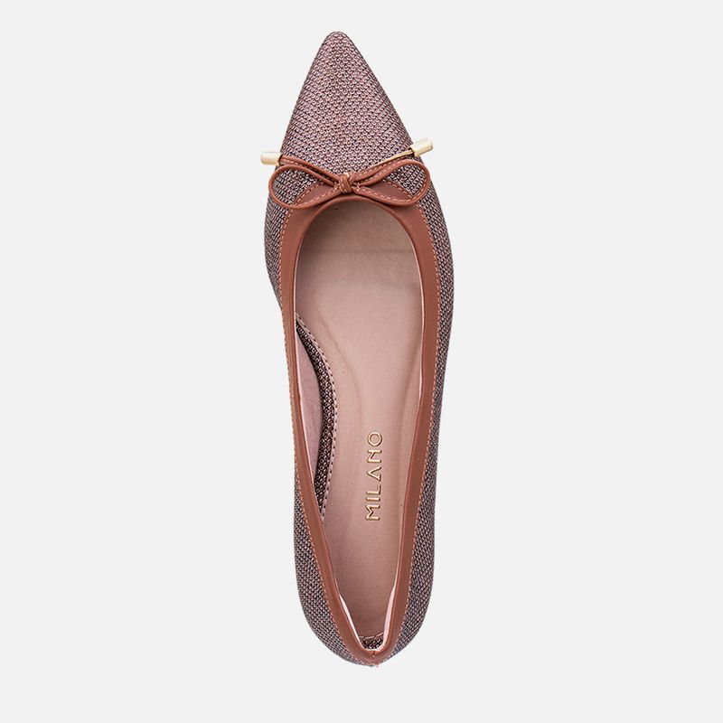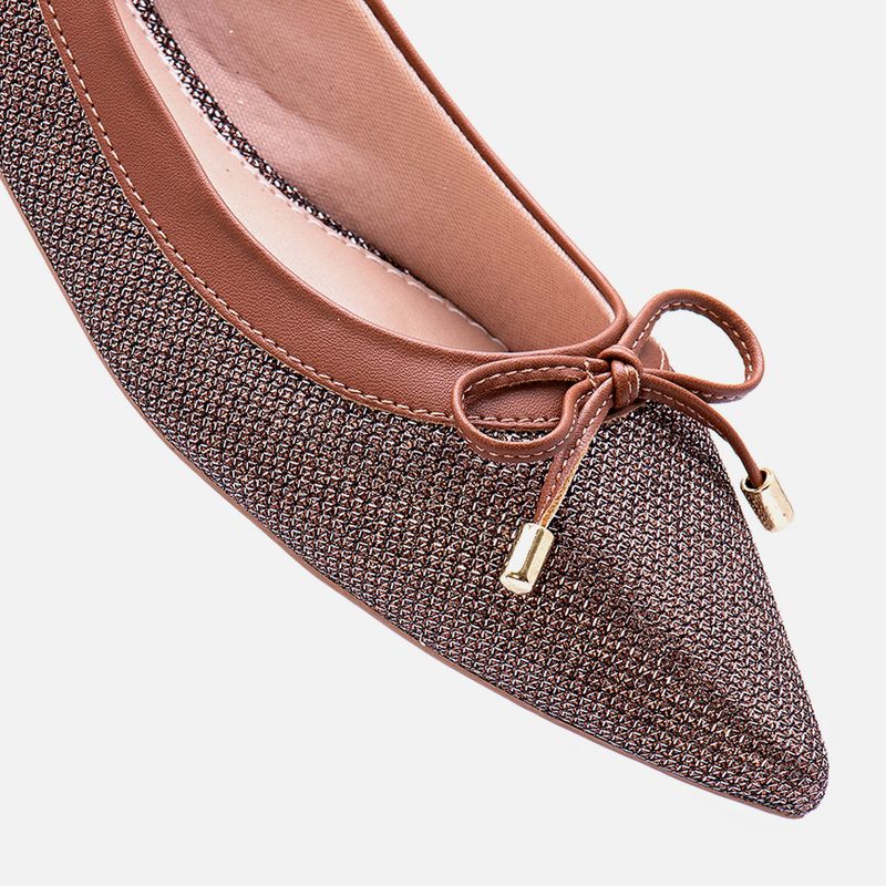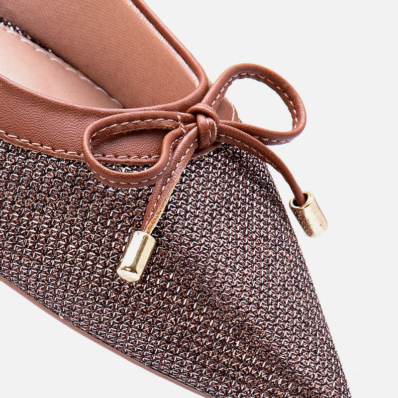 Sapatilha com salto rasteiro, bico fino, revestida em lurex, com contorno do cano em material com brilho verniz e costura pesponto, detalhe no peito do pé em nozinho delicado com ponteiras metálicas na cor dourada e palmilha macia com aplicação do logo em etiqueta 3D.