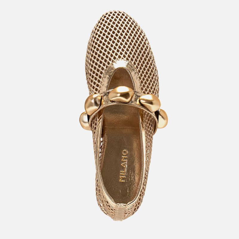 Sapatilha Fechada em Tela Tramado Transparencia com Tira Elástica com Aplicação de Peças Metalizadas com Formato Orgânico cor Champagne. Com solado rasteiro emborrachado no mesmo tom do produto com saltinho mínimo, cabedal feito em tela na tendência atual – tipo tramado ou mesh ou ainda em transparência, traseira e bico arredondado, com recorte em U no peito do pé com contorno em napa verniz, detalhe em elástico no peito do pé médio com aplicação de peças com formato orgânico na cor dourada e cromado. A palmilha interna é macia no mesmo tom do produto com a marca Milano aplicada em etiqueta 3D na cor dourada.