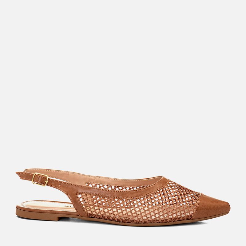 Sapatilha Rasteira Metalizada Slingback Aberta em Tela Transparência com Bico Fino Decote Arredondado Biqueira Destacada Verniz na cor Caramelo. Com solado emborrachado na cor caramelo com saltinho mínimo, palmilha com traseira arredondada e bico fino revestida em napa metalizada, cabedal feito em tela com trama média e transparência com biqueira destacada em napa brilho metalizada, decote arredondado no peito do pé e tira slingback cruzada no tornozelo – o decote e tira tem contorno também em napa metalizada, a tira que cruza o calcanhar faz o fechamento com ajuste e regulagem do calce por fivela. A palmilha tem aplique macio na cor preta com costura pesponto fazendo o contorno da forma e a marca Milano aplicada em etiqueta 3D na cor dourada.