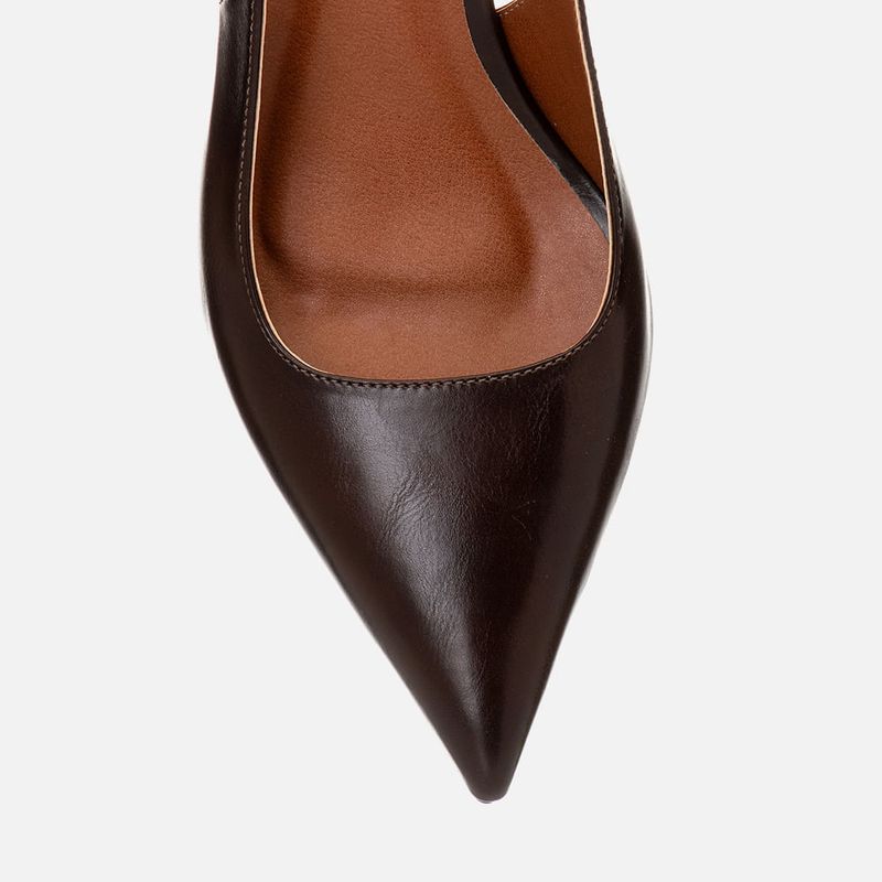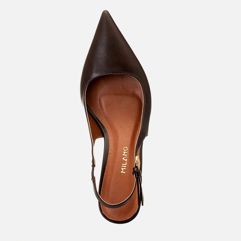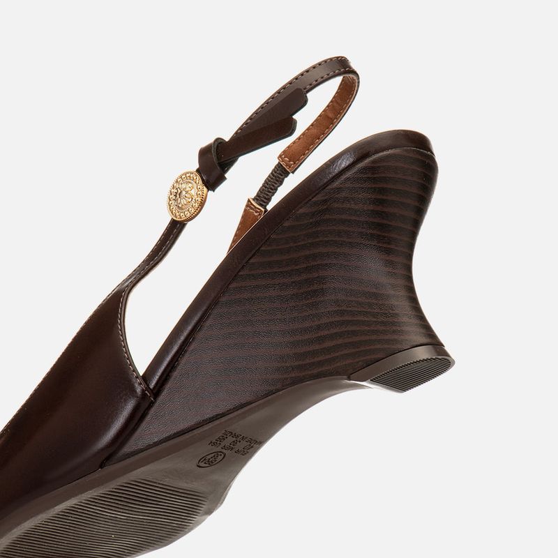 Scarpin Anabela Aberta Slingback com Aplique Brilho Boho Moeda Metalizada Salto Geométrico Escultural tipo Madeira Bico Fino e Decote Cavado Quadrado na cor Café. Com solado emborrachado no mesmo tom do produto, salto anabela lapidado com formato geométrico tipo wedge, ou em formato sinuoso de onda, revestido em material com toque amadeirado, cabedal e salto revestido em napa, palmilha encaixada com traseira arredondada e bico fino, decote cavado quadrado no peito do pé com tira slingback saindo das laterais e cruzadas no calcanhar, esta tira faz o fechamento em elástico na parte interna, sendo calce prático sem amarrações, nesta tira tem um detalhe em aplique de peça metalizada com formato de moeda estilo bojo e um aplique em lacinho no mesmo material do produto. A palmilha tem aplique super macio em sobretom ao produto com detalhe em contorno em costura pesponto com a marca Milano em etiqueta 3D na cor dourada.