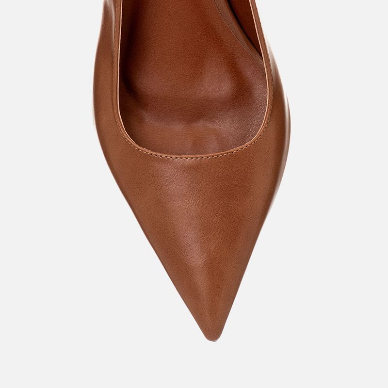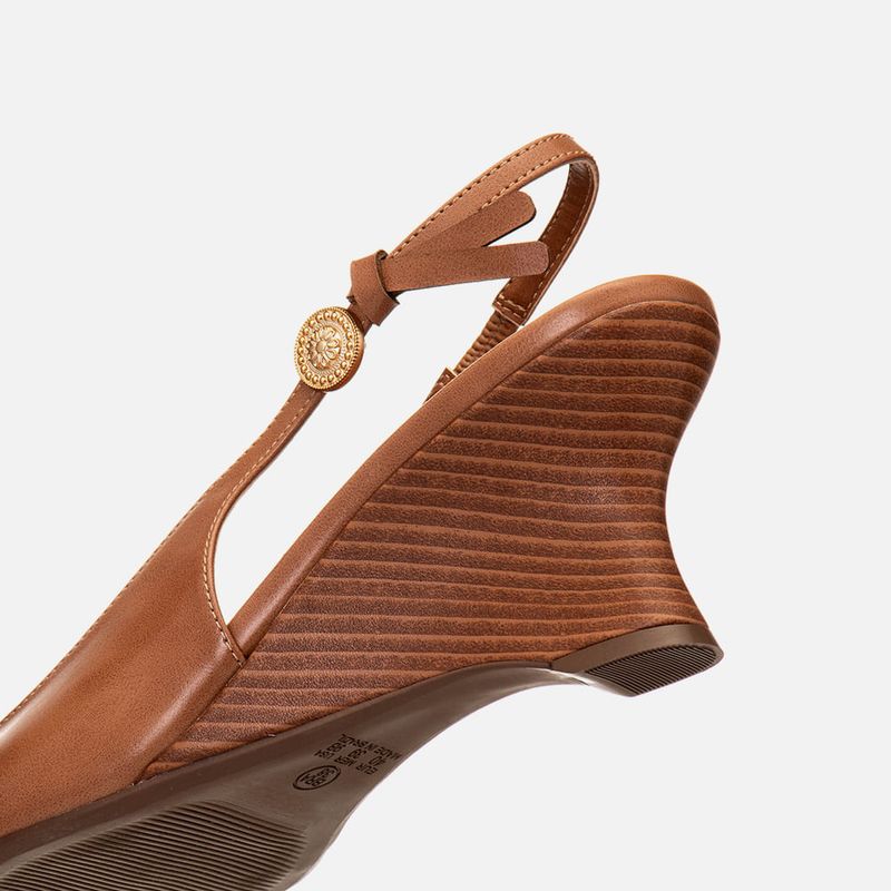 Scarpin Anabela Aberta Slingback com Aplique Brilho Boho Moeda Metalizada Salto Geométrico Escultural tipo Madeira Bico Fino e Decote Cavado Quadrado na cor Caramelo. Com solado emborrachado no mesmo tom do produto, salto anabela lapidado com formato geométrico tipo wedge, ou em formato sinuoso de onda, revestido em material com toque amadeirado, cabedal e salto revestido em napa, palmilha encaixada com traseira arredondada e bico fino, decote cavado quadrado no peito do pé com tira slingback saindo das laterais e cruzadas no calcanhar, esta tira faz o fechamento em elástico na parte interna, sendo calce prático sem amarrações, nesta tira tem um detalhe em aplique de peça metalizada com formato de moeda estilo bojo e um aplique em lacinho no mesmo material do produto. A palmilha tem aplique super macio em sobretom ao produto com detalhe em contorno em costura pesponto com a marca Milano em etiqueta 3D na cor dourada.