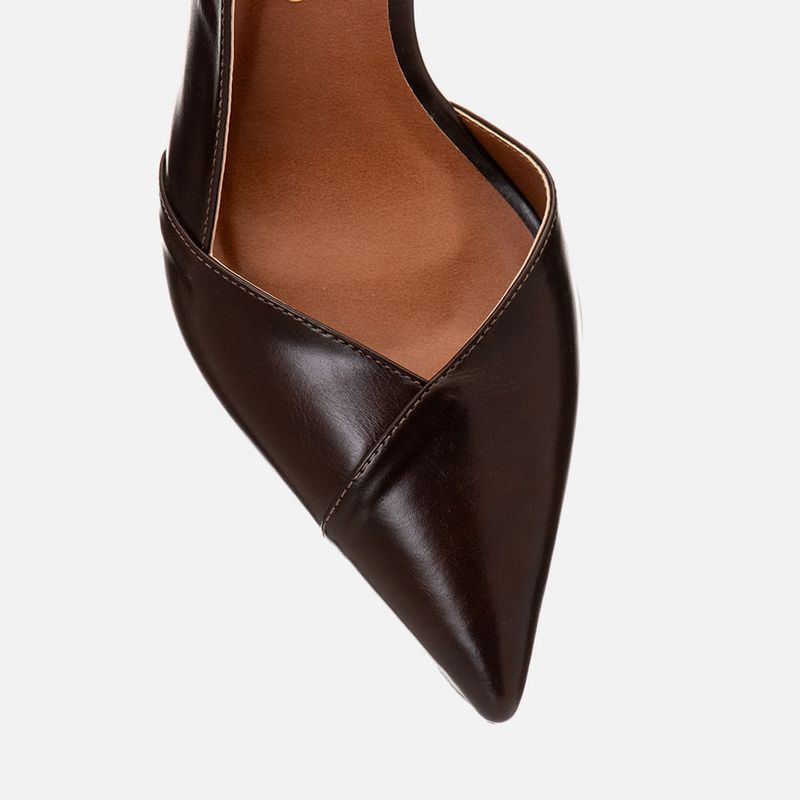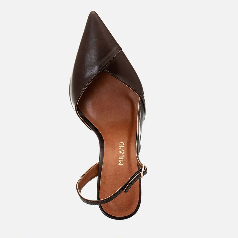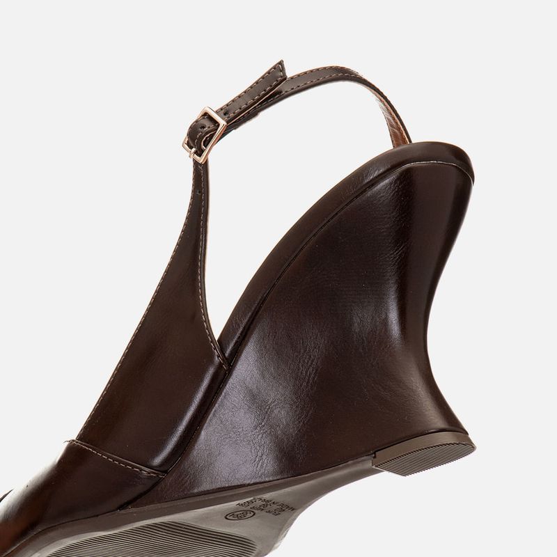 Scarpin Anabela Aberta Slingback com Recortes e Salto Geométrico Escultural com Bico Fino e Decote Cavado em V na cor Café. Com solado emborrachado no mesmo tom do produto, salto anabela lapidado com formato geométrico tipo wedge, ou em formato sinuoso de onda, cabedal e salto revestido em napa, palmilha encaixada com traseira arredondada e bico fino, decote cavado profundo em V no peito do pé, feito com recortes no cabedal, assim como a tira slingback saindo da lateral externa e cruzada no tornozelo pela traseira até a parte interna do pé, esta tira faz o fechamento em fivela para ajuste e regulagem do calce. A palmilha tem aplique super macio na cor nude com a marca Milano em etiqueta 3D na cor dourada.