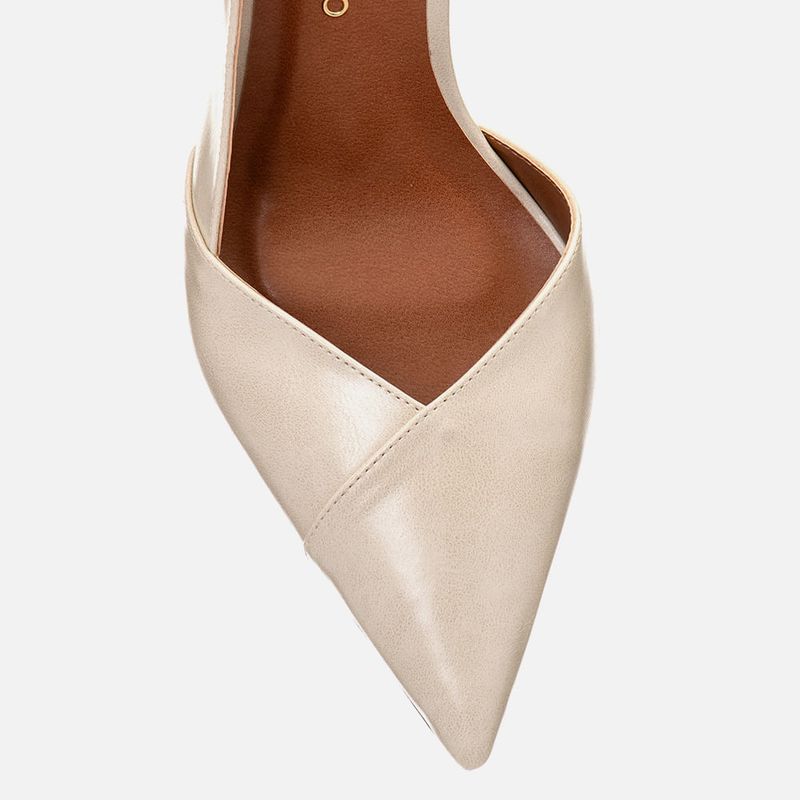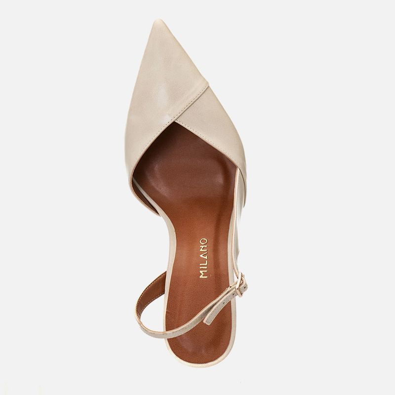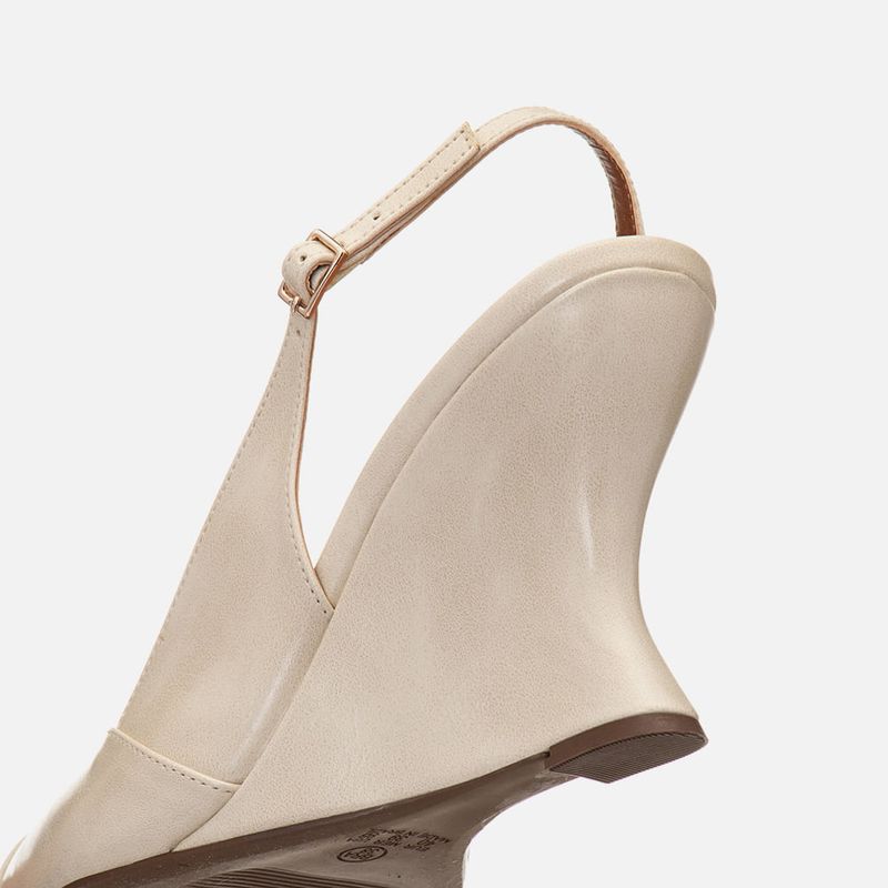 Scarpin Anabela Aberta Slingback com Recortes e Salto Geométrico Escultural com Bico Fino e Decote Cavado em V na cor Off White. Com solado emborrachado no mesmo tom do produto, salto anabela lapidado com formato geométrico tipo wedge, ou em formato sinuoso de onda, cabedal e salto revestido em napa, palmilha encaixada com traseira arredondada e bico fino, decote cavado profundo em V no peito do pé, feito com recortes no cabedal, assim como a tira slingback saindo da lateral externa e cruzada no tornozelo pela traseira até a parte interna do pé, esta tira faz o fechamento em fivela para ajuste e regulagem do calce. A palmilha tem aplique super macio na cor nude com a marca Milano em etiqueta 3D na cor dourada.