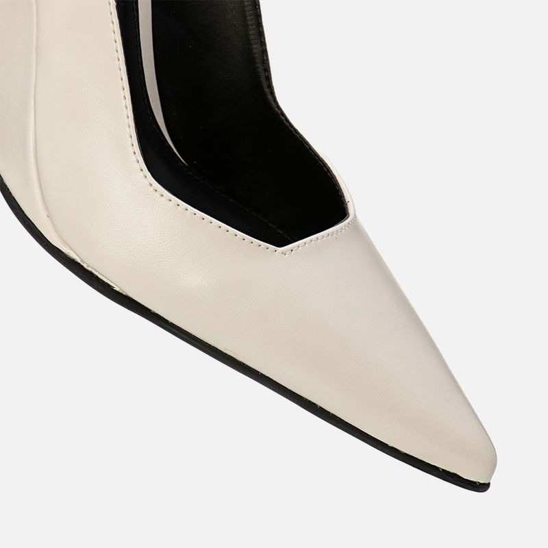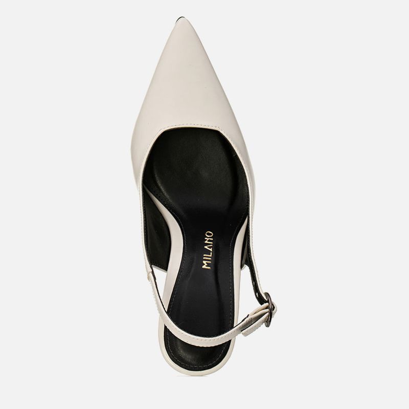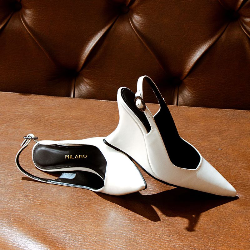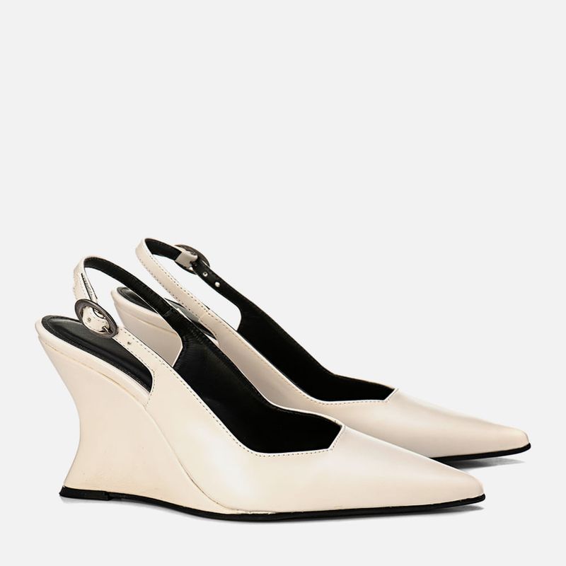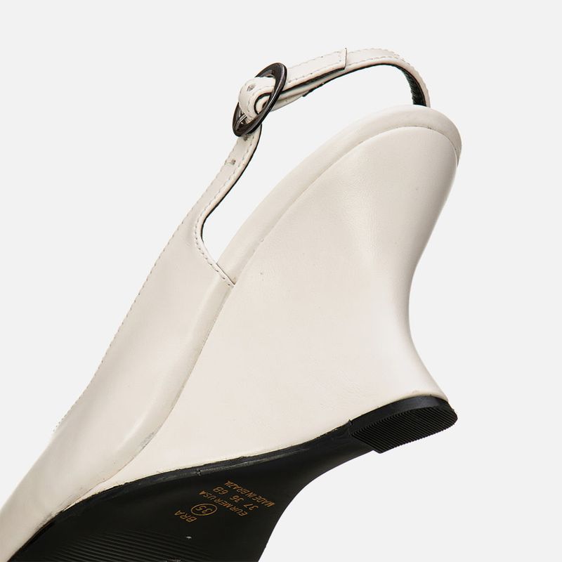 Scarpin Anabela Aberta Slingback com Salto Geométrico tipo Wedge Lapidado e Sinuoso com Bico Fino e Decote Cavado Quadrado na cor Off White. Com solado emborrachado na cor preta, salto anabela lapidado com formato geométrico tipo wedge, ou em formato sinuoso de onda, cabedal e salto revestido em napa, palmilha com traseira arredondada e bico fino, decote cavado quadrado no peito do pé com tira slingback saindo das laterais e cruzadas no calcanhar, esta tira faz o fechamento com ajuste e regulagem do calce em fivela redondo em metal dourado. O interior é forrado em preto, a palmilha tem aplique macio no também em preto com detalhe em contorno em costura pesponto com a marca Milano em etiqueta 3D na cor dourada.