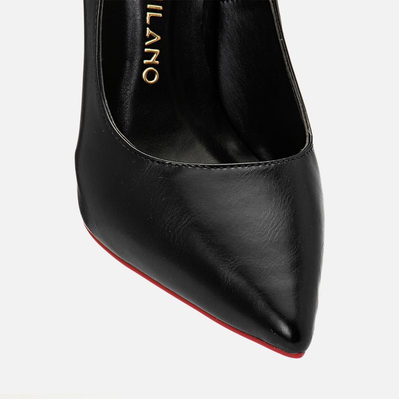 Scarpin Fechado Clássico com Salto Fino Alto Sola Vermelha e Meia Pata Interna na cor Preto. Com solado emborrachado na cor vermelha sob o taco do salto e parte frontal da palmilha, salto super alto fino tipo agulha no mesmo tom do produto, cabedal fechado com traseira arredondada e bico fino, decote arredondado no peito do pé com detalhe em contorno em costura pesponto, interior revestido em napa, palmilha com aplique macio no mesmo tom do produto com a marca Milano aplicada em etiqueta 3D na cor dourada.