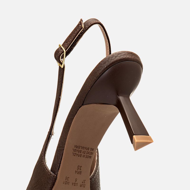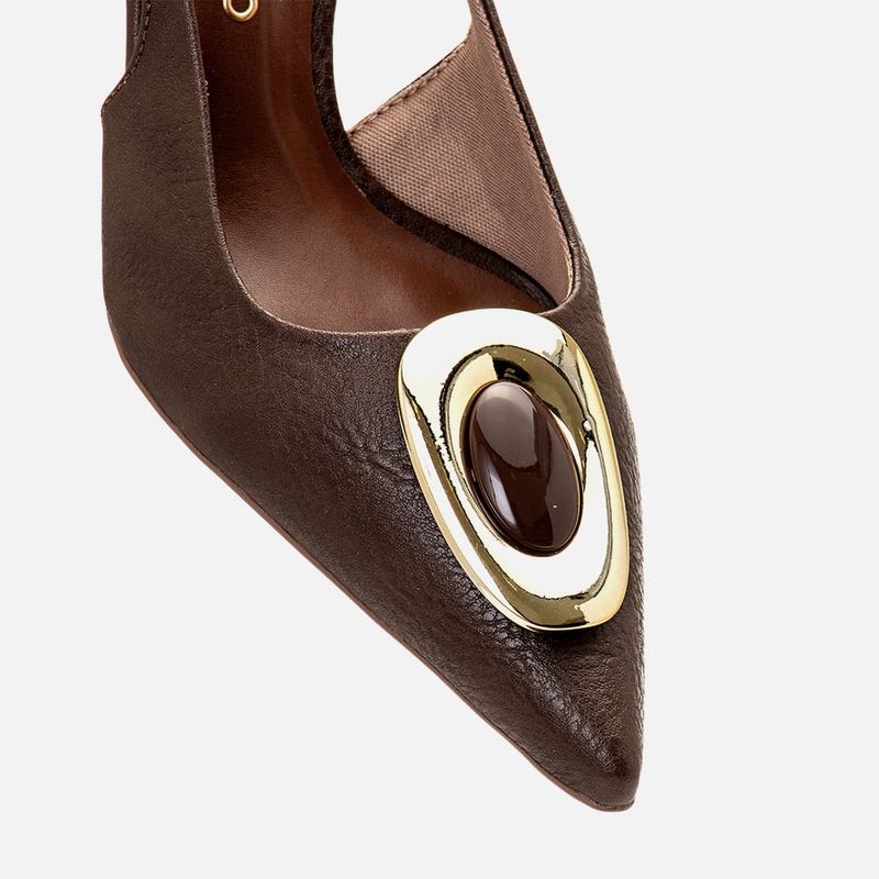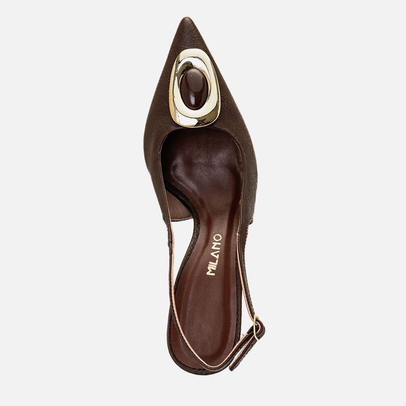 Scarpin Salto Médio Taça Slingback com Bico Fino e Aplicação em Peça Metalizada com Pedraria em Resina na cor Marrom. Com solado emborrachado na cor caramelo sob o salto e parte frontal do cabedal, salto médio tipo taça no mesmo tom do produto, palmilha com traseira arredondada e bico fino, cabedal fechado na frente e aberto na traseira, possui decote quadrado com cantos arredondados no peito do pé e detalhe em aplicação de peça grande metalizada com formato orgânico com pedra em resina translucida no centro, do cabedal se estendem as tiras tipo slingback que cruzam na traseira do tornozelo fazendo o fechamento por fivela com regulagem e ajuste do calce. A palmilha tem aplique em tom nude com a marca Milano na cor dourada.