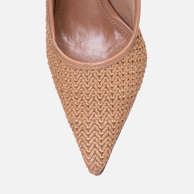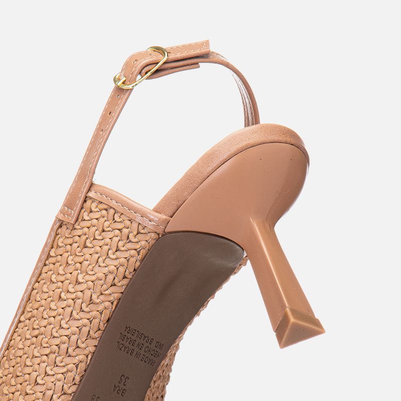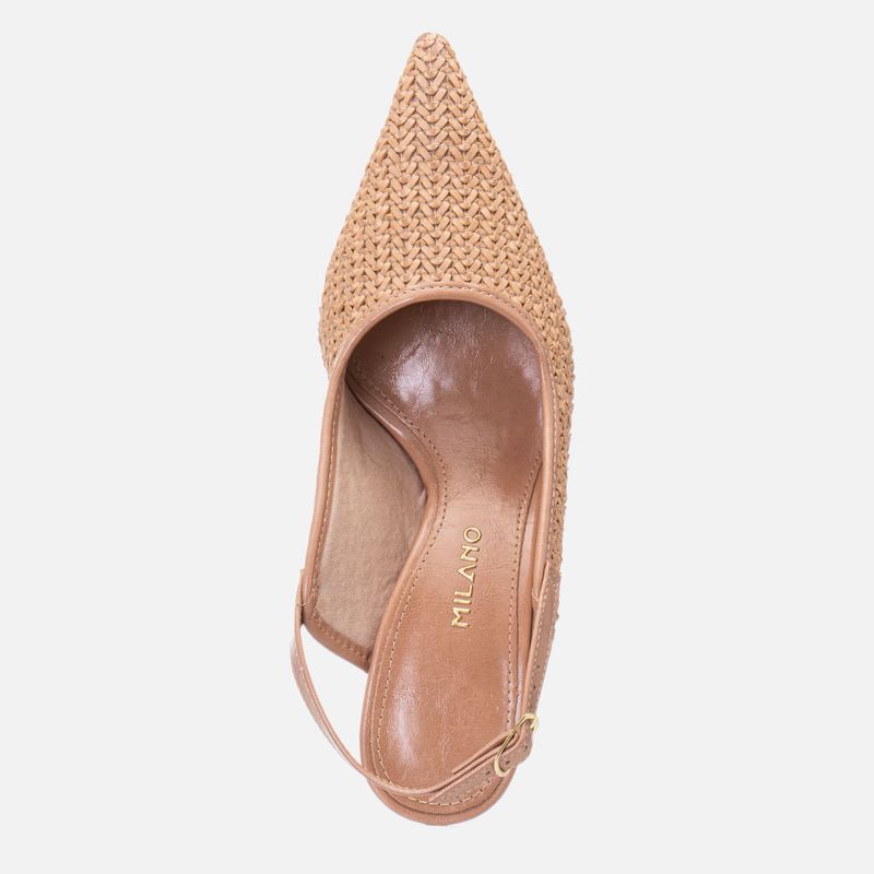 Scarpin Salto Médio Taça Slingback Cabedal em Tramado tipo Tressê na cor Natural. Com solado emborrachado na cor caramelo, sob o salto e parte frontal da palmilha, salto com altura média fino tipo taça no mesmo tom do produto, palmilha com traseira arredondada e bico fino, cabedal fechado feito em material tramado tipo tressê, possui ainda decote arredondado no peito do pé e tira fazendo o contorno do formato do cabedal com aplique de tira slingback cruzando a lateral do peito do pé e fazendo o fechamento por fivela, com ajuste e regulagem do calce para maior conforto. A palmilha tem aplique macio no mesmo tom do produto com a marca Milano em etiqueta 3D na cor dourada.