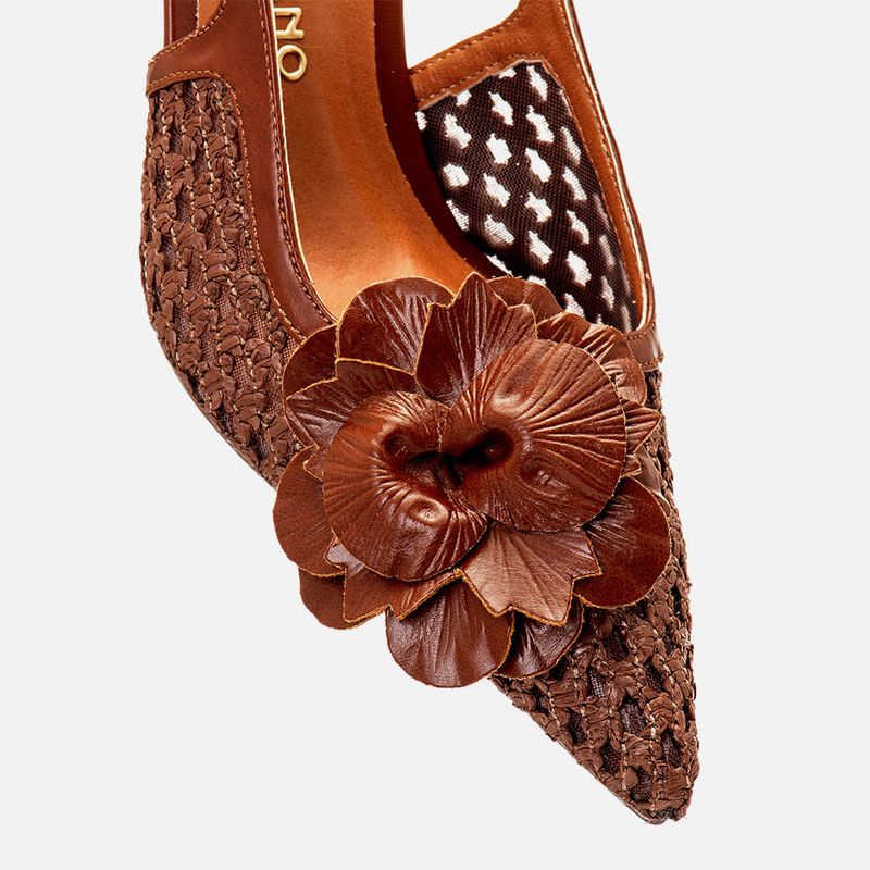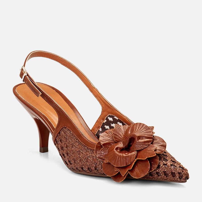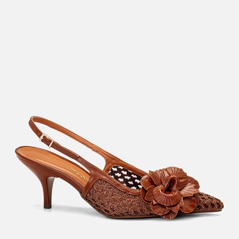 Scarpin Salto Médio Taça Slingback Cabedal em Tramado Natural Artesanal com Transparência e Aplique de Flor na cor Caramelo. Com solado emborrachado na cor caramelo, sob o salto e parte frontal da palmilha, salto com altura média fino tipo taça, palmilha com traseira arredondada e bico fino, cabedal fechado feito em transparência com detalhe em tramado tipo artesanal tramado com aplique de flor grande em napa sob o peito do pé, possui ainda decote quadrado no peito do pé, e todo o cabedal tem tira fazendo o contorno da forma com a tira slingback cruzando a lateral do peito do pé e fazendo o fechamento por fivela, com ajuste e regulagem do calce para maior conforto. A palmilha tem aplique macio em tom nude com a marca Milano em etiqueta 3D na cor dourada.
