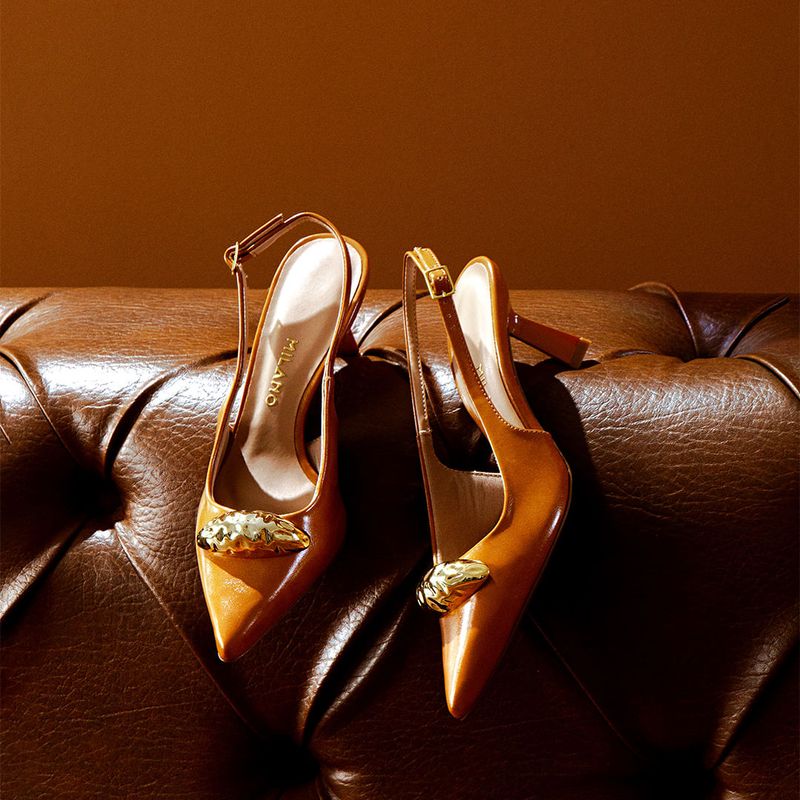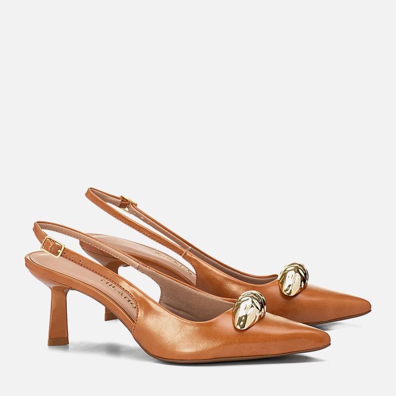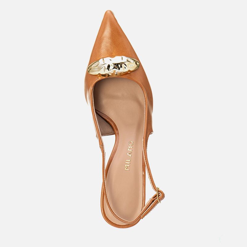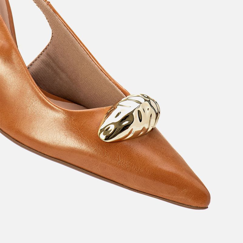 Scarpin Slingback Aberto De Salto Alto Taça com Bico Fino Decote Quadrado e Detalhe em Peça Orgânica Dourada Cromada na cor Caramelo. Com salto alto fino tipo taça, palmilha com traseira arredondada e bico fino com solado emborrachado na cor caramelo, cabedal com decote quadrado e tiras tipo slinback saindo das laterais e cruzadas no tornozelo fazendo o fechamento com ajuste e regulagem do calce por fivela, o modelo possui detalhe em peça com formato orgânico na cor dourada cromada aplicado sobre o peito do pé. A forração do cabedal e tiras é feita em tecido na cor nude, a palmilha possui aplique em napa nude macia com a marca Milano em etiqueta 3D na cor dourada.