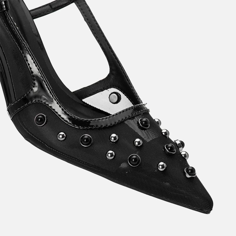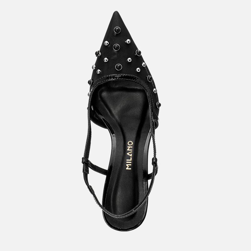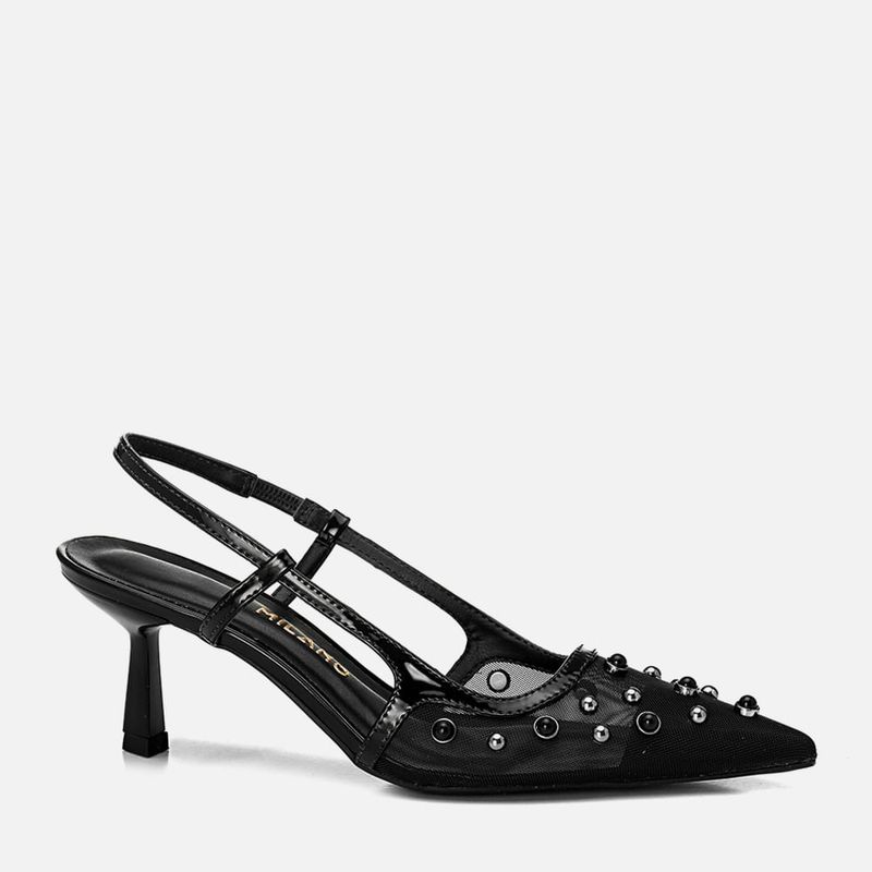 Scarpin Slingback Salto Médio Taça com Transparência e Aplicação Boho em Tachas Resina e Rebites Metalizados com Calce Prático em Elástico na cor Preta. Com salto alto médio tipo taça no mesmo tom do produto, palmilha com traseira arredondada e bico fino, cabedal aberto no tornozelo com recorte arredondado no peito do pé sendo feito em tela tipo tule com transparência, forrado no bico e com contorno em material com brilho verniz, esse contorno possui tira tipo slingback cruzada no tornozelo para fechamento em calce prático com elástico no mesmo tom do produto na parte interna do pé. O bico tem aplicações em tachas, ou stud, no estilo boho sendo feita em mix de metal com peça resinada também em preto e rebites meia esfera metalizado na cor dourada. A palmilha possui aplique macio com a marca Milano aplicada em etiqueta 3D na cor dourada.