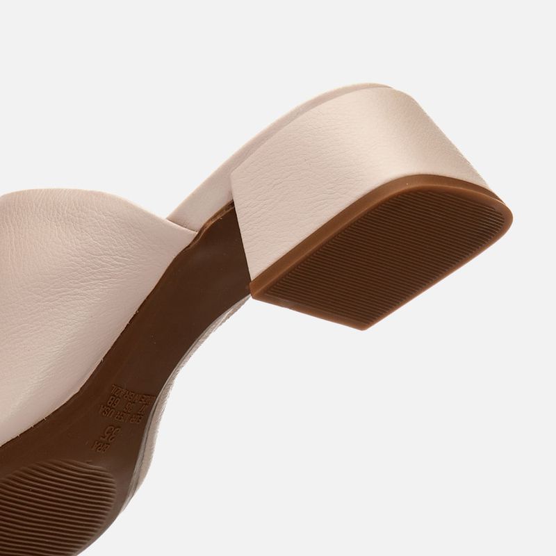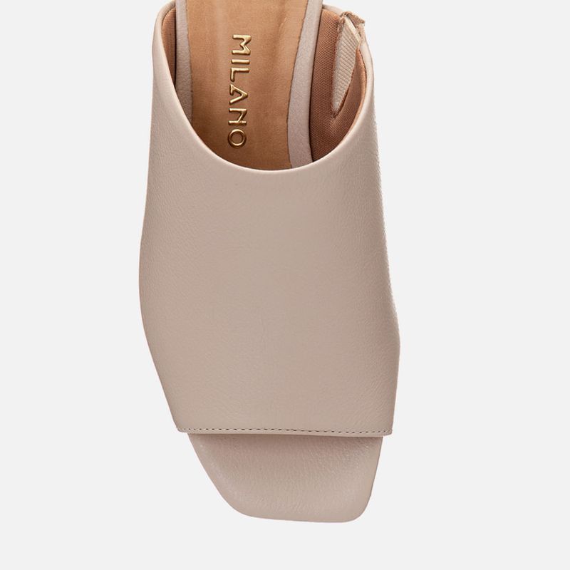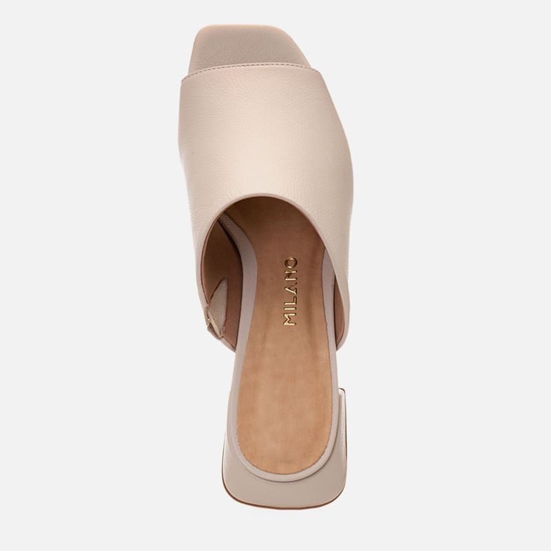 Tamanco Feito em Couro com Salto Médio Bloco Trapézio e Tira Slide Larga na cor Off White. Com solado emborrachado sob o salto e parte frontal da palmilha, salto médio bloco com formato geométrico trapézio, palmilha encaixada com traseira arredondada e bico quadrado, cabedal feito em tira larga tipo slide sob o peito do pé deixando os dedos à mostra, possui elástico na parte interna para melhor adaptação do calce – o modelo é feito em couro legítimo. A palmilha tem aplique macio na cor nude com a marca Milano aplicada em etiqueta 3D na cor dourada.