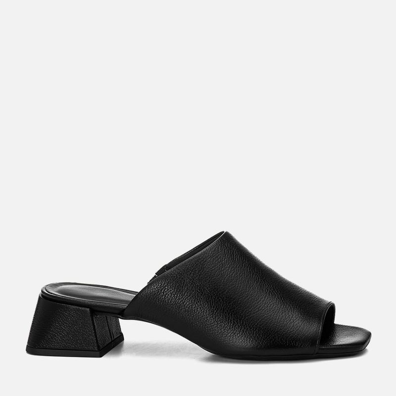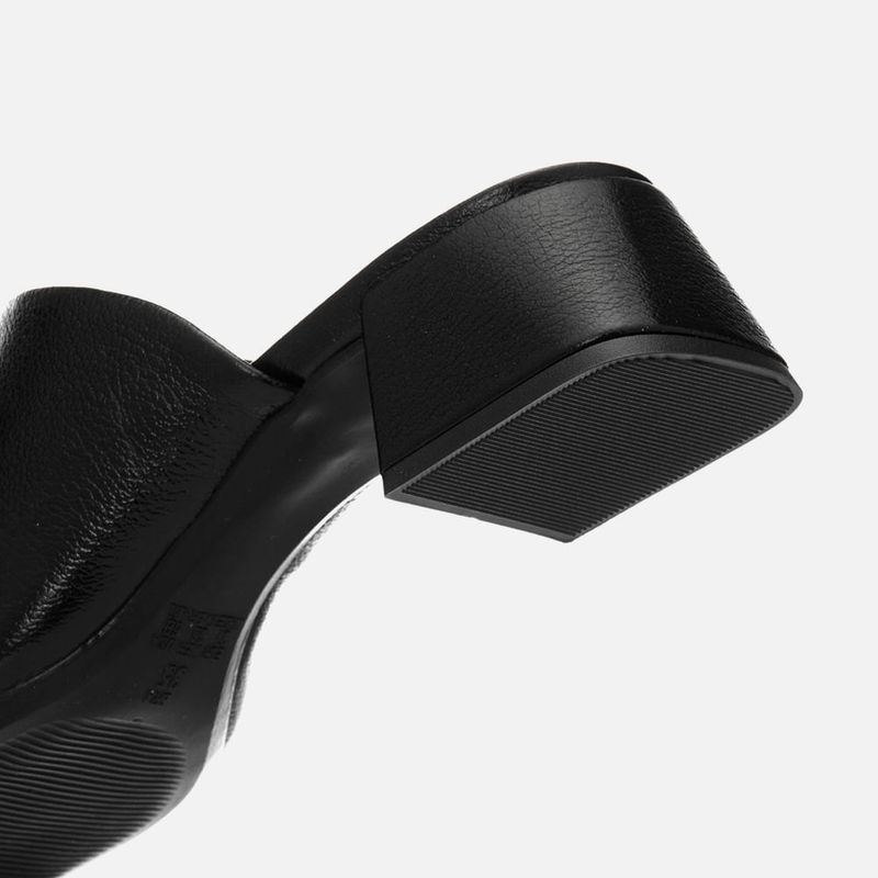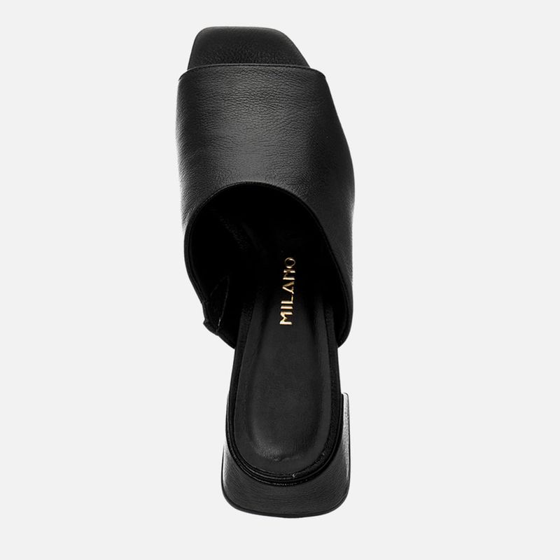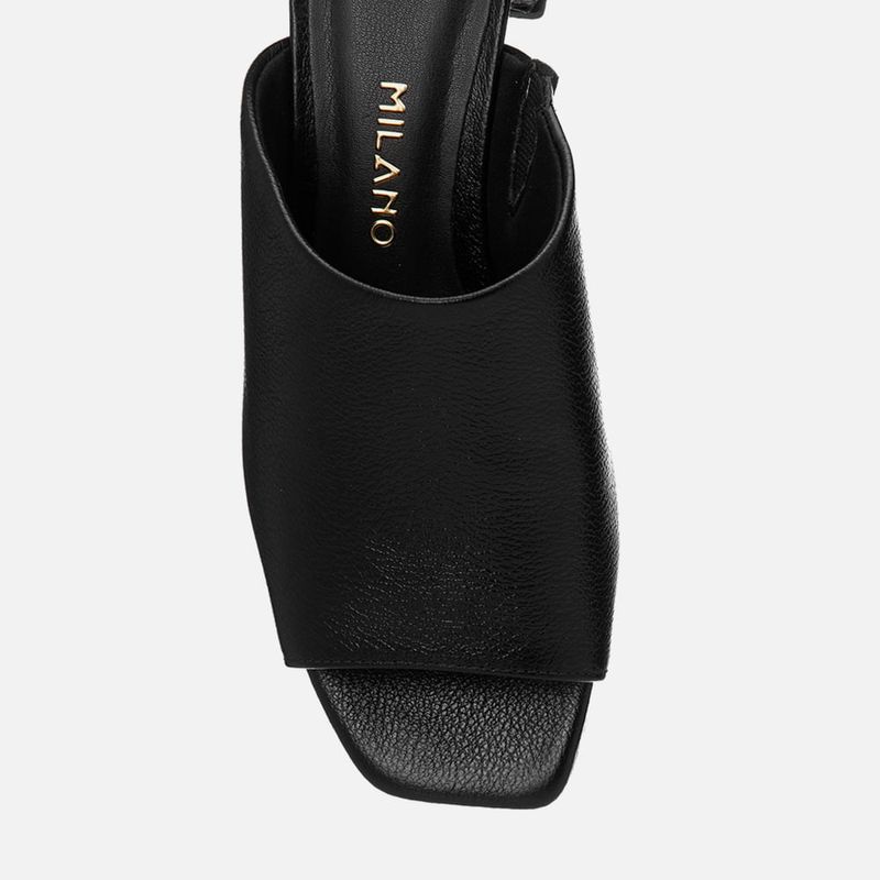 Tamanco Feito em Couro com Salto Médio Bloco Trapézio e Tira Slide Larga na cor Preto. Com solado emborrachado sob o salto e parte frontal da palmilha, salto médio bloco com formato geométrico trapézio, palmilha encaixada com traseira arredondada e bico quadrado, cabedal feito em tira larga tipo slide sob o peito do pé deixando os dedos à mostra, possui elástico na parte interna para melhor adaptação do calce – o modelo é feito em couro legítimo. A palmilha tem aplique macio na cor nude com a marca Milano aplicada em etiqueta 3D na cor dourada.