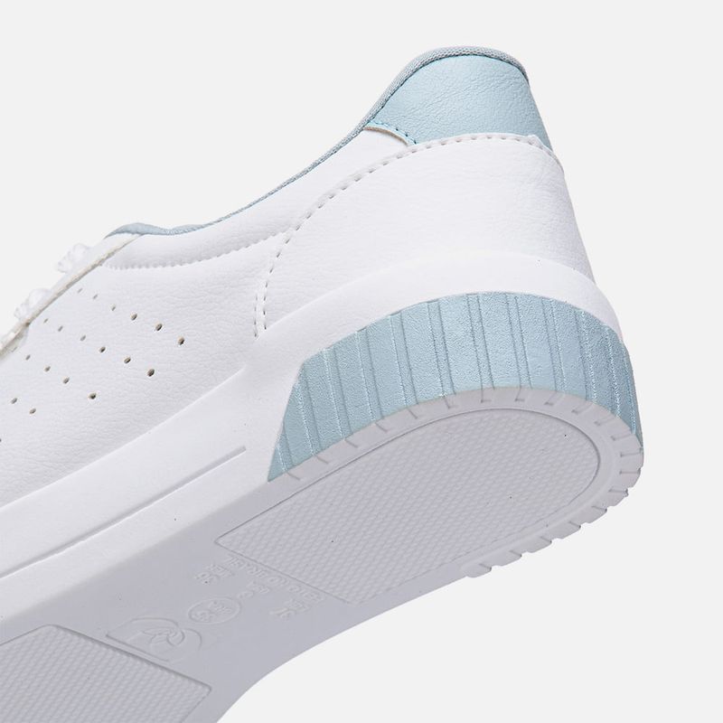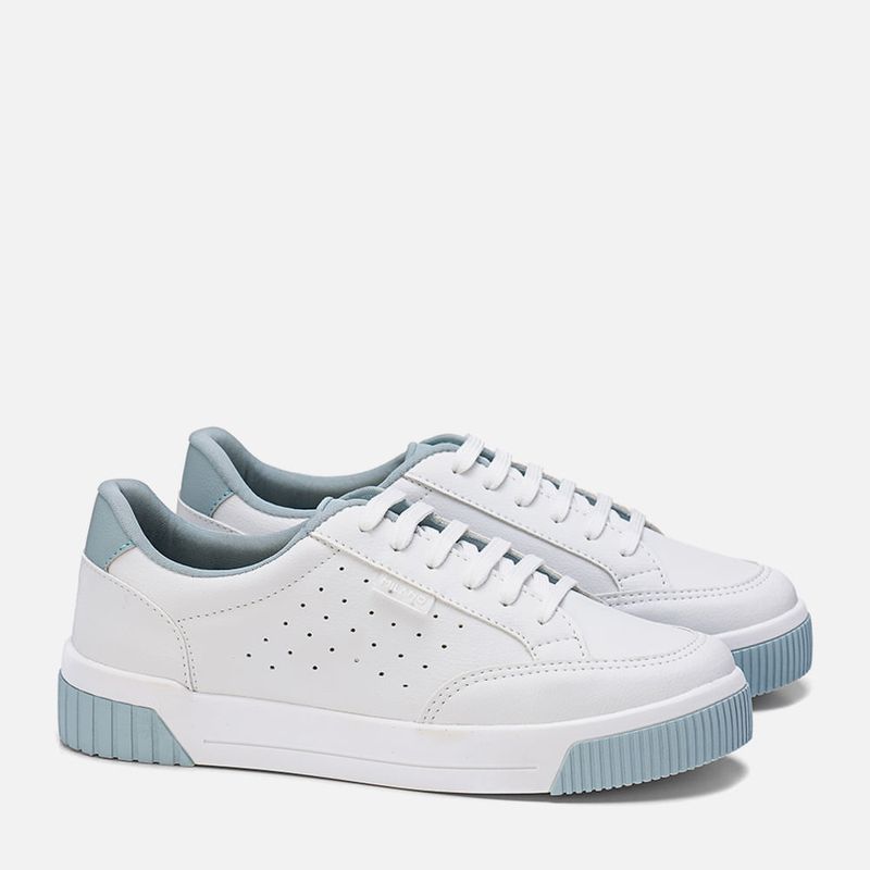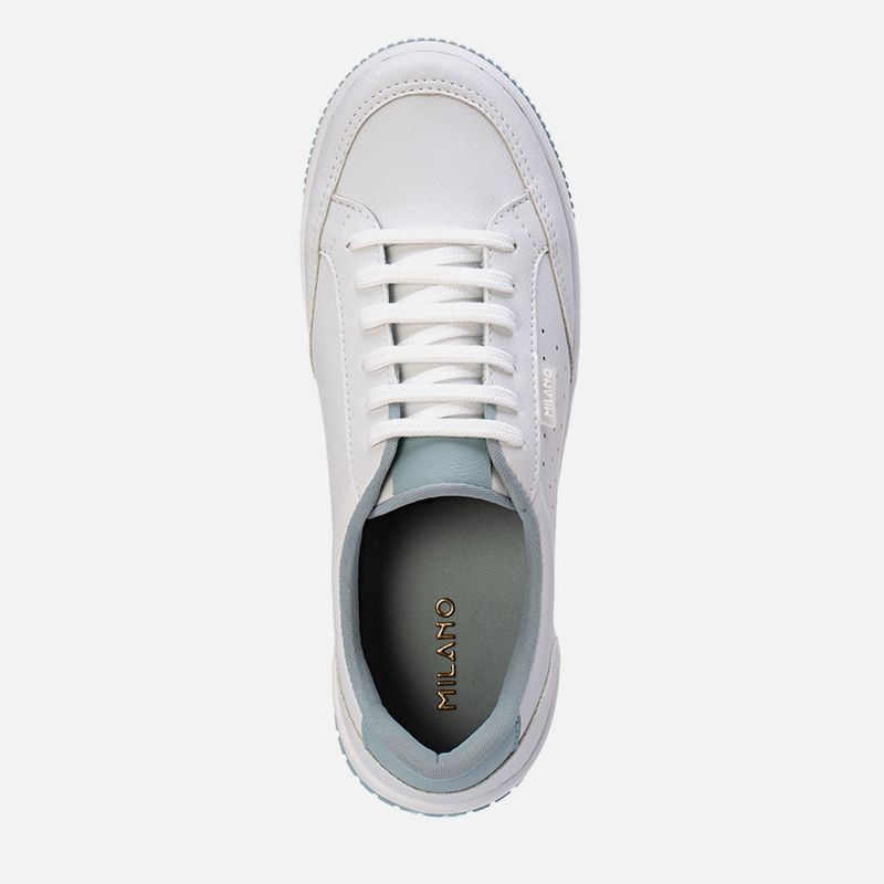 Tênis Branco Sola Caixa Média Bicolor, Detalhe em Furação e Contorno Macio do Cano para Calce mias Confortável na cor Azul. Com solado flatform tipo caixa com detalhes 3D bicolor no bico e traseira, bico arredondado e cabedal com detalhe em etiqueta transparente com a marca Milano em Branco na lateral, cadarço em achatado sem ilhós e interior do cano acolchoado para maior conforto e forrado no mesmo tom do produto. A palmilha é macia e tem a marca Milano aplicada em etiqueta 3D na cor dourada.