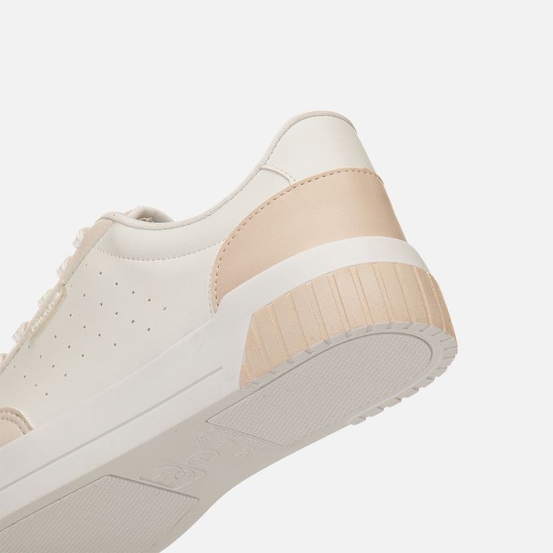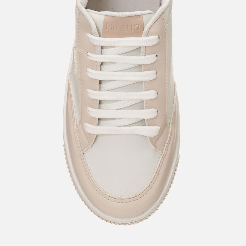 Tênis Branco Sola Caixa Média Bicolor, Detalhe em Furação e Contorno Macio do Cano para Calce mias Confortável na cor Bege. Com solado flatform tipo caixa com detalhes 3D bicolor no bico e traseira, bico arredondado e cabedal com detalhe em etiqueta transparente com a marca Milano em Branco na lateral, cadarço em achatado sem ilhós e interior do cano acolchoado para maior conforto e forrado no mesmo tom do produto. A palmilha é macia e tem a marca Milano aplicada em etiqueta 3D na cor dourada.
