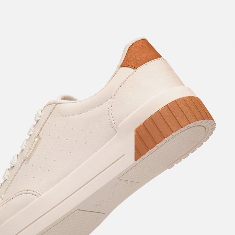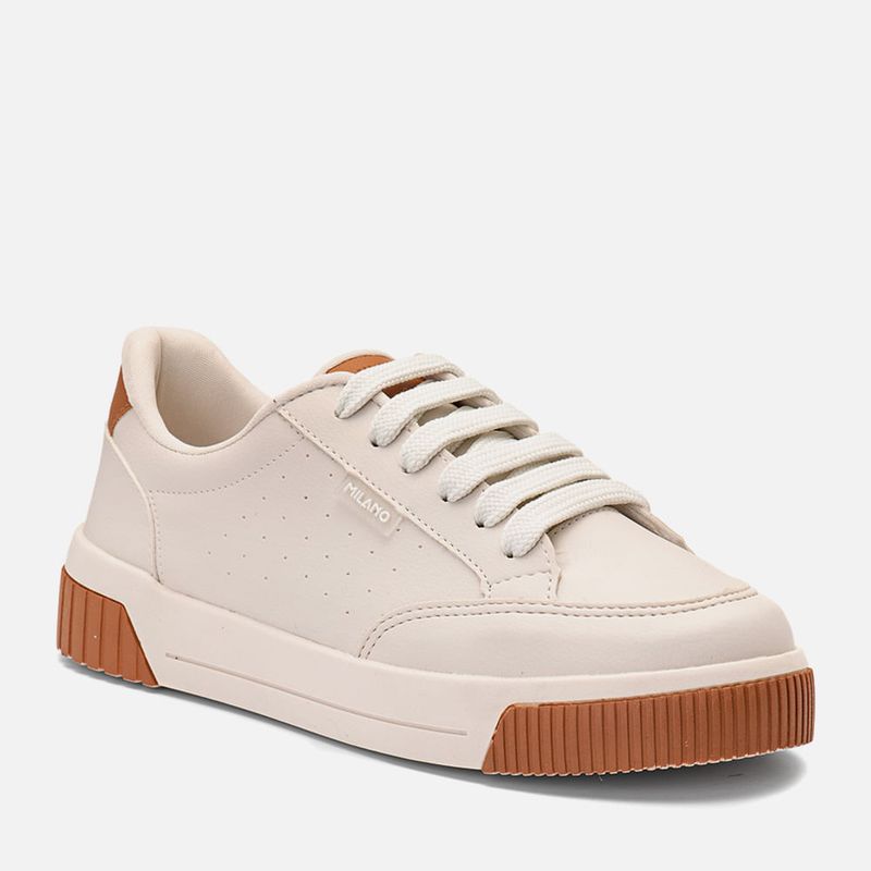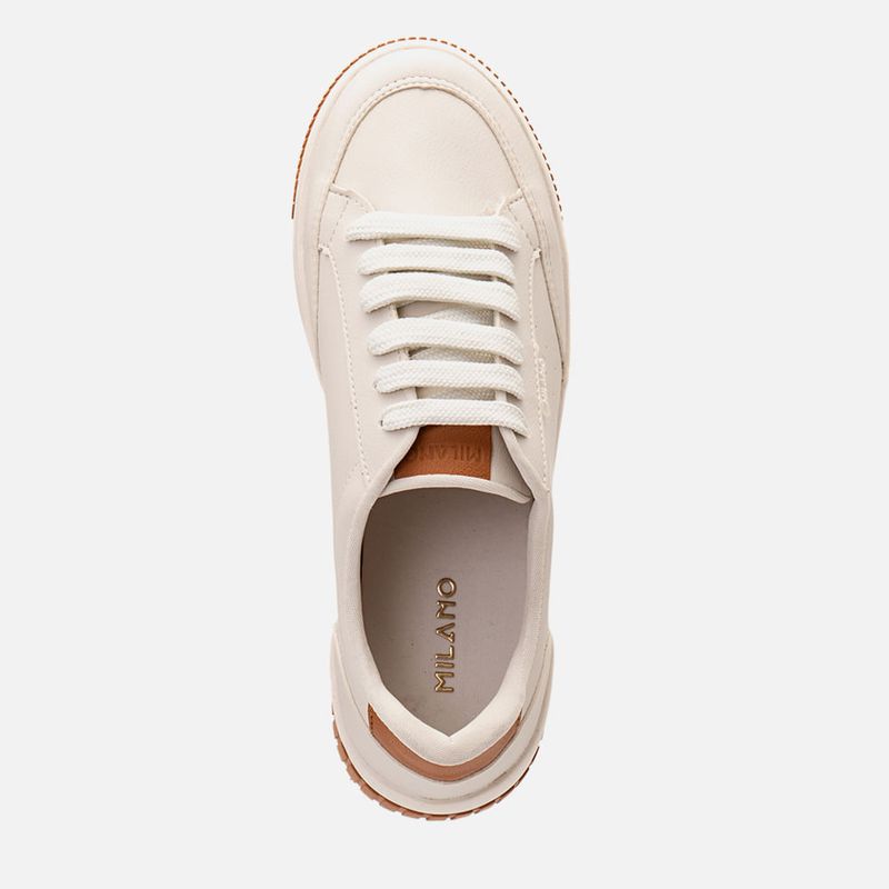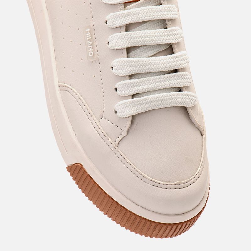 Tênis Branco Sola Caixa Média Bicolor, Detalhe em Furação e Contorno Macio do Cano para Calce mias Confortável na cor Caramelo. Com solado flatform tipo caixa com detalhes 3D bicolor no bico e traseira, bico arredondado e cabedal com detalhe em etiqueta transparente com a marca Milano em Branco na lateral, cadarço em achatado sem ilhós e interior do cano acolchoado para maior conforto e forrado no mesmo tom do produto. A palmilha é macia e tem a marca Milano aplicada em etiqueta 3D na cor dourada.