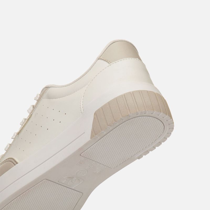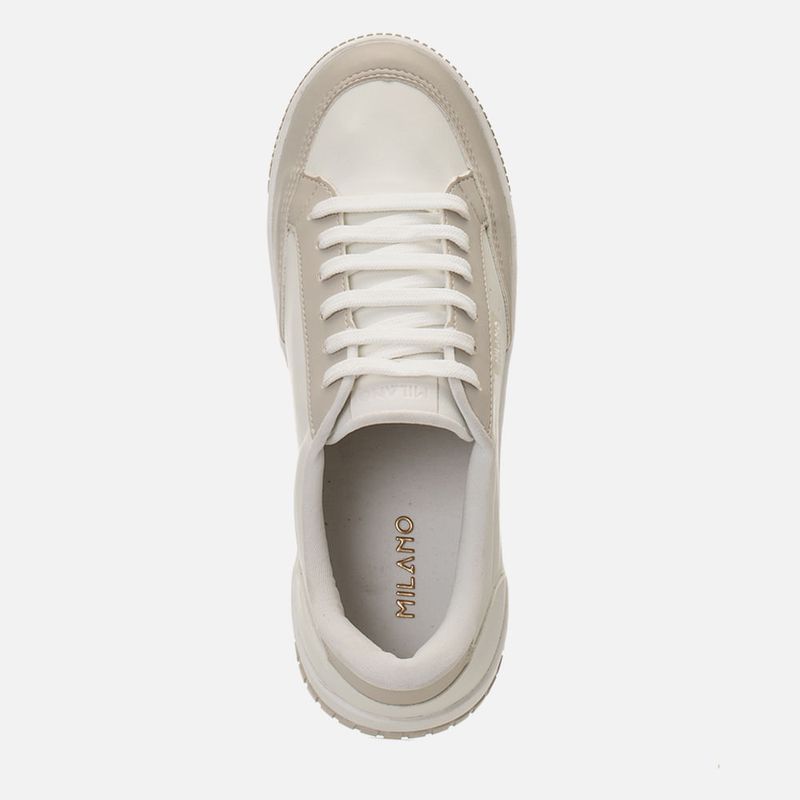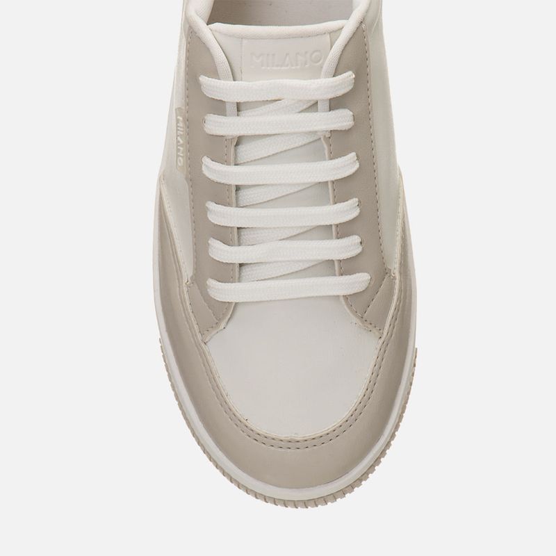 Tênis Branco Sola Caixa Média Bicolor, Detalhe em Furação e Contorno Macio do Cano para Calce mias Confortável na cor Niquel. Com solado flatform tipo caixa com detalhes 3D bicolor no bico e traseira, bico arredondado e cabedal com detalhe em etiqueta transparente com a marca Milano em Branco na lateral, cadarço em achatado sem ilhós e interior do cano acolchoado para maior conforto e forrado no mesmo tom do produto. A palmilha é macia e tem a marca Milano aplicada em etiqueta 3D na cor dourada.