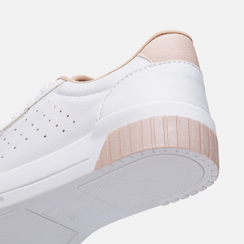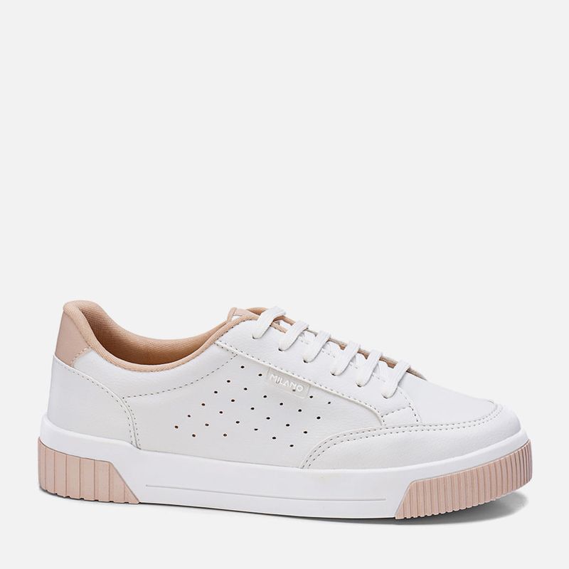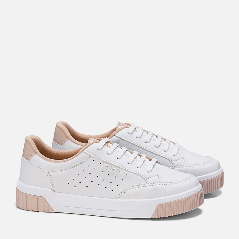 Tênis Branco Sola Caixa Média Bicolor, Detalhe em Furação e Contorno Macio do Cano para Calce mias Confortável na cor Rosado. Com solado flatform tipo caixa com detalhes 3D bicolor no bico e traseira, bico arredondado e cabedal com detalhe em etiqueta transparente com a marca Milano em Branco na lateral, cadarço em achatado sem ilhós e interior do cano acolchoado para maior conforto e forrado no mesmo tom do produto. A palmilha é macia e tem a marca Milano aplicada em etiqueta 3D na cor dourada.