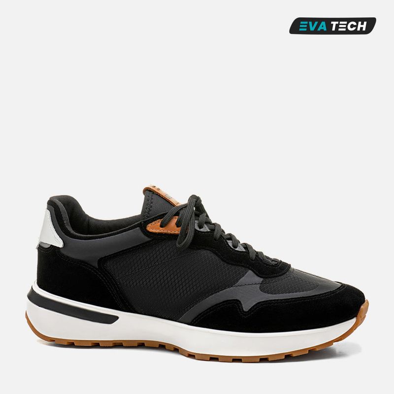 Tênis casual masculino com mix de detalhes em couros e tecidos para um visual moderno e diferenciado. Solado tricolor em E.V.A e borracha, proporcionando leveza e aderência. Palmilha com calcanheira anatômica forrada em couro para conforto extra. Forração em tecido para respirabilidade e bem-estar durante o uso. Detalhe da linha E.V.A Tech, garantindo inovação e desempenho ao calçado.